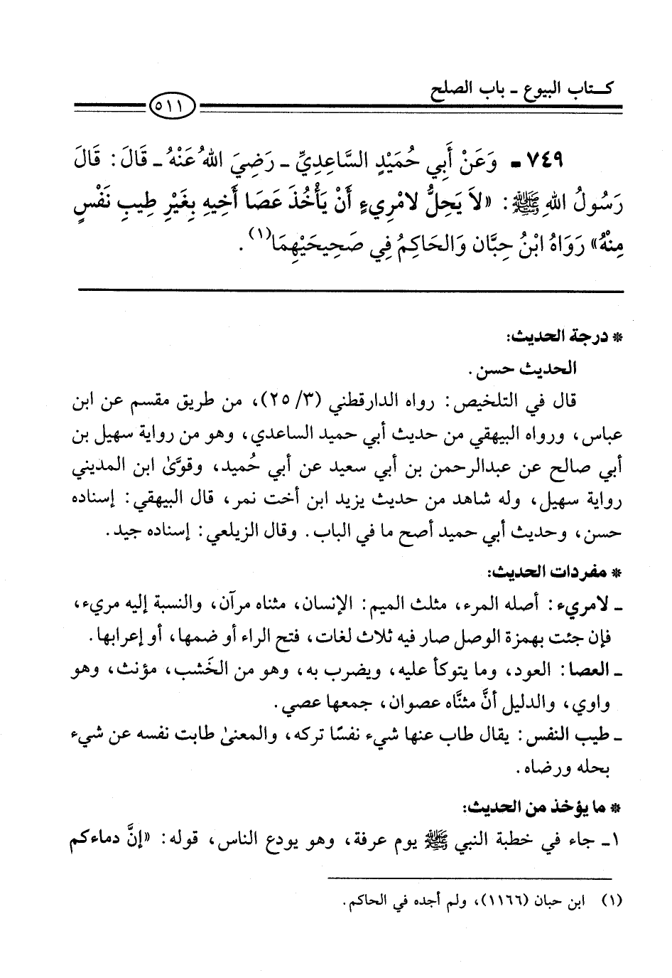 749 - وَعَنْ أَبِي حُمَيْدٍ السَّاعِدِيِّ -رَضِيَ اللهُ عَنْهُ- قَالَ: قَالَ رَسُولُ اللهِ -صلى الله عليه وسلم-: "لاَ يَحِلُّ لامْرِيءٍ أنْ يَأُخُذَ عَصَا أخِيهِ بِغَيْرِ طِيبِ نَفْسٍ مِنْهُ" رَوَاهُ ابْنُ حِبَّان وَالحَاكِمُ فِي صَحِيحَيْهِمَا (¬1).