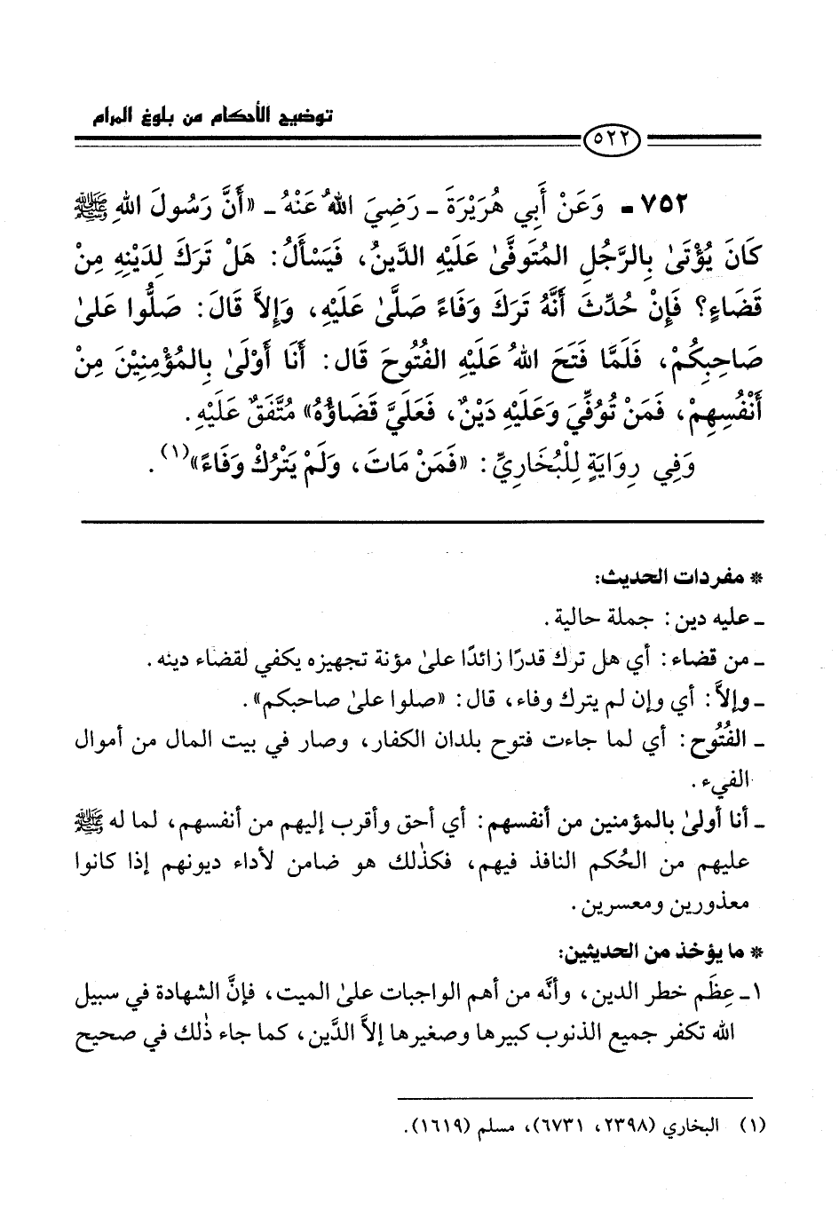 752 - وَعَنْ أَبِي هُرَيْرَةَ -رضي الله عنه- "أنَّ رَسُولَ اللهِ -صلى الله عليه وسلم- كَانَ يُؤْتَى بِالرَّجُلِ المُتَوفَّى عَلَيْهِ الدَّينُ، فَيَسْأَلُ: هَلْ تَرَكَ لِدَيْنِهِ مِنْ قَضَاءٍ؟ فَإِنْ حُدِّثَ أنَّهُ تَرَكَ وَفَاءً صَلَّى عَلَيْهِ، وَإِلاَّ قَالَ: صَلُّوا عَلى صَاحِبِكُمْ، فَلَمَّا فَتَحَ اللهُ عَلَيْهِ الفُتُوحَ قَال: أنَا أوْلَى بِالمُؤْمِنِيْنَ مِنْ أنْفُسِهِمْ، فَمَنْ تُوُفِّيَ وَعَلَيْهِ دَيْنٌ، فَعَلَيَّ قَضَاؤُهُ" مُتَّفَقٌ عَلَيْهِ.