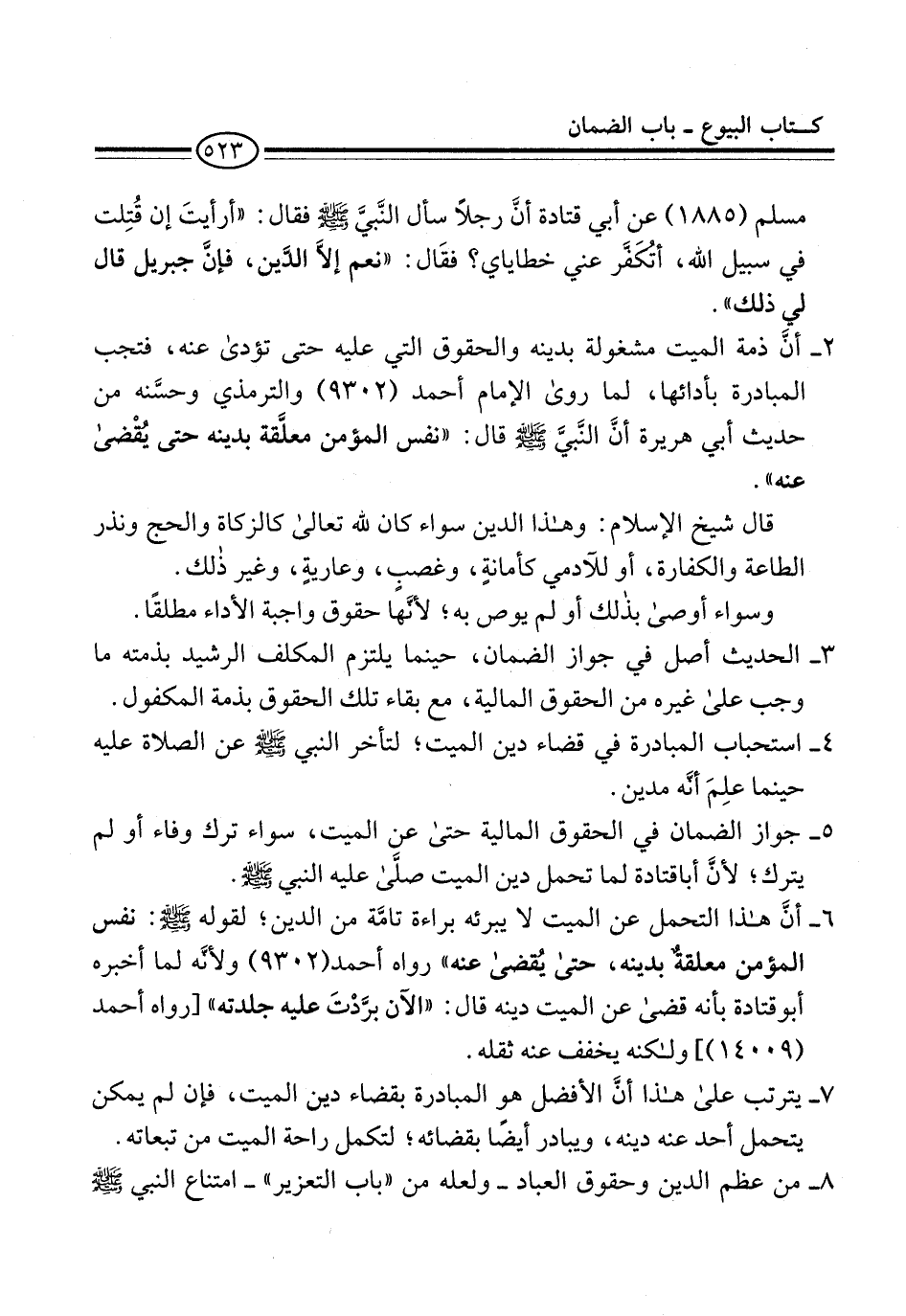 مسلم (1885) عن أبي قتادة أنَّ رجلاً سأل النَّبيَّ -صلى الله عليه وسلم- فقال: "أرأيتَ إن قُتِلت في سبيل الله، أتكَفَّر عني خطاياي؟ فقَال: "نعم إلاَّ الدَّين، فإنَّ جبريل قال لي ذلك".