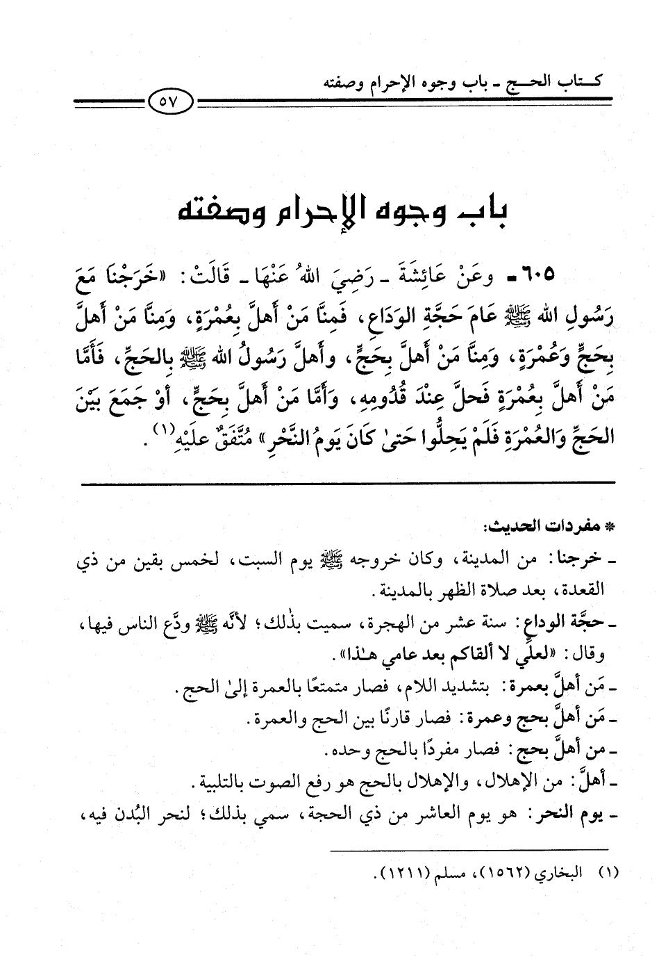 605 - وعَنْ عَائِشَةَ -رَضِيَ اللهُ عَنْهَا- قَالَتْ: "خَرَجْنَا مَعَ رَسُولِ الله -صلى الله عليه وسلم- عَامَ حَجَّةِ الوَدَاعِ، فَمِنَّا مَنْ أَهلَّ بِعُمْرَةٍ، وَمِنَّا مَنْ أَهلَّ بِحَجٍّ وَعُمْرَةٍ، وَمِنَّا مَنْ أَهلَّ بِحَجٍّ، وأَهلَّ رَسُولُ الله -صلى الله عليه وسلم- بالحَجِّ، فَأَمَّا مَنْ أَهلَّ بِعُمْرَةٍ فَحلَّ عِنْدَ قُدُومِهِ، وَأَمَّا مَنْ أَهلَّ بِحَجٍّ، أَوْ جَمَعَ بَيْنَ الحَجِّ وَالعُمْرَةِ فَلَمْ يَحِلُّوا حَتى كانَ يَومُ النَّحْرِ" مُتَّفَقٌ علَيْهِ (¬1).