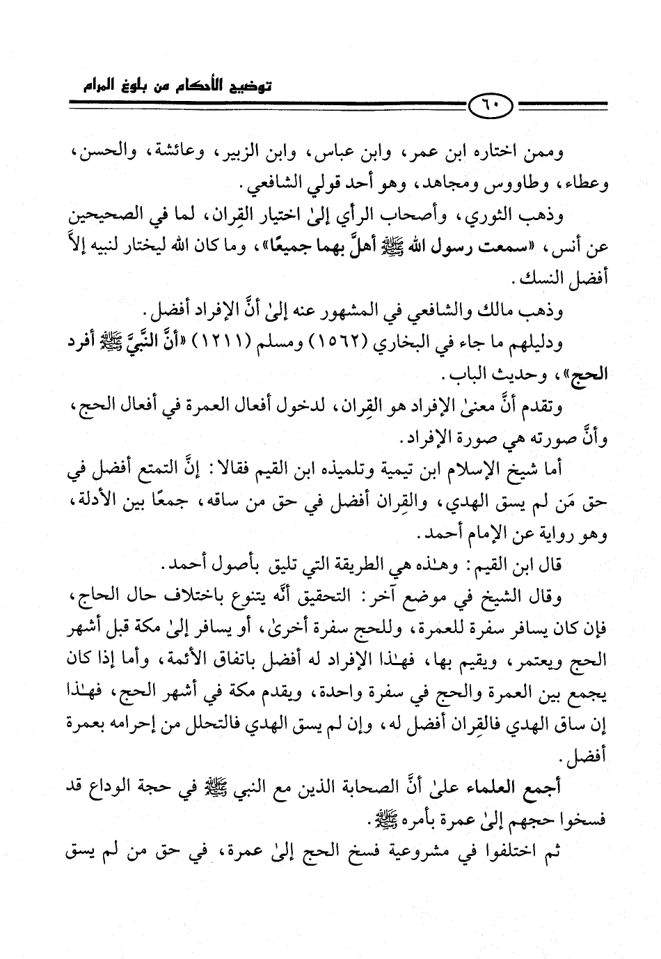 وقال الشيخ في موضع آخر: التحقيق أنَّه يتنوع باختلاف حال الحاج، فإن كان يسافر سفرة للعمرة، وللحج سفرة أخرى، أو يسافر إلى مكة قبل أشهر الحج ويعتمر، ويقيم بها، فهذا الإفراد له أفضل باتِّفاق الأئمة، وأما إذا كان يجمع بين العمرة والحج في سفرة واحدة، ويقدم مكة في أشهر الحج، فهذا إن ساق الهدي فالقِران أفضل له، وإن لم يسق الهدي فالتحلل من إحرامه بعمرة أفضل.
