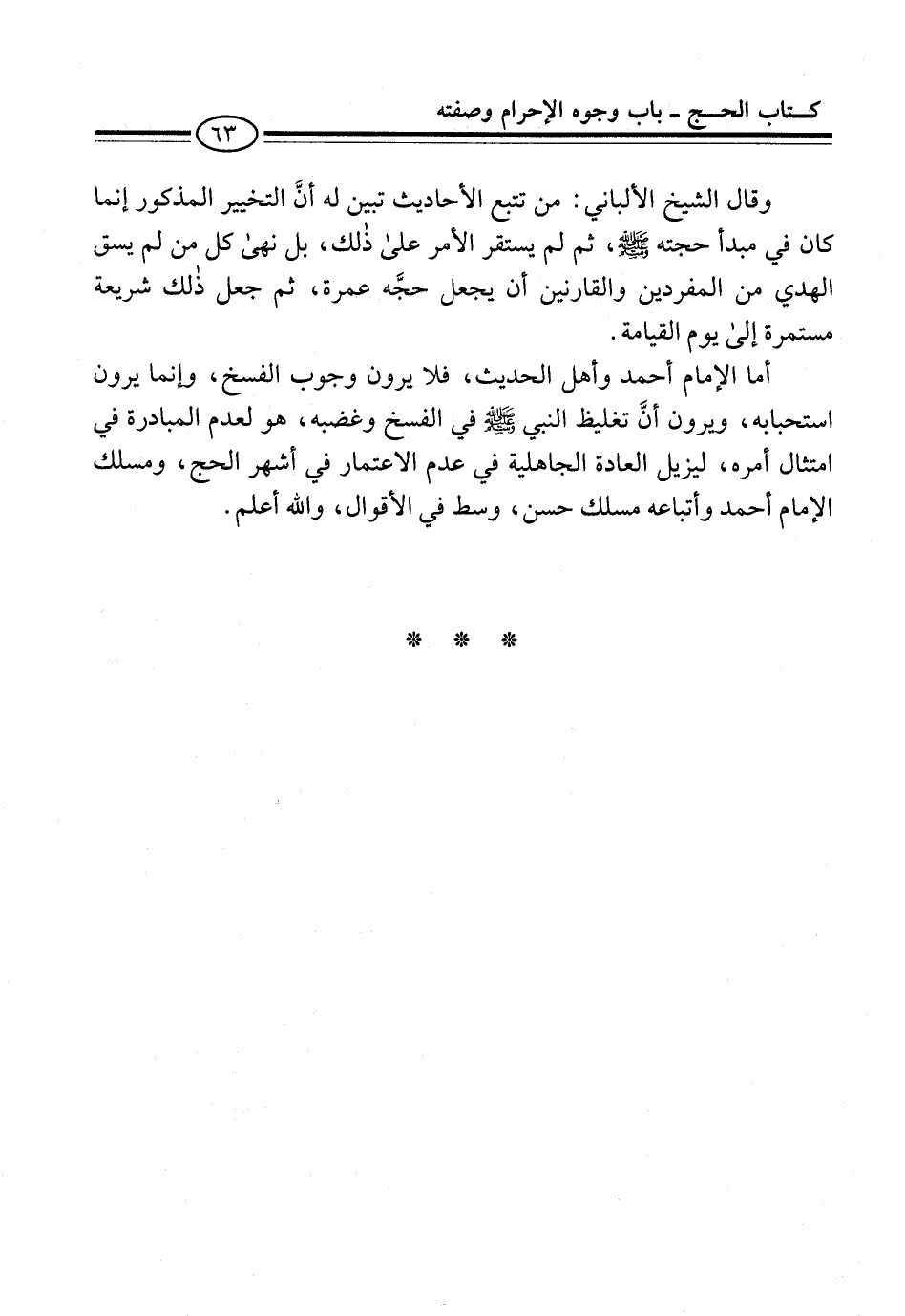 وقال الشيخ الألباني: من تتبع الأحاديث تبين له أنَّ التخيير المذكور إنما كان في مبدأ حجته -صلى الله عليه وسلم-، ثم لم يستقر الأمر على ذلك، بل نهى كل من لم يسق الهدي من المفردين والقارنين أن يجعل حجَّه عمرة، ثم جعل ذلك شريعة مستمرة إلى يوم القيامة.