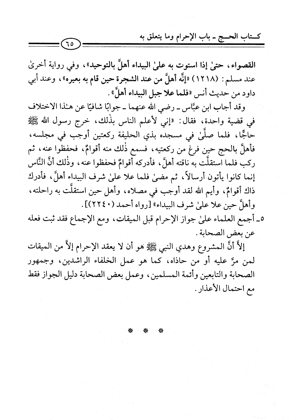 القصواء، حتى إذا استوت به على البيداء أهلَّ بالتوحيد"، وفي رواية أخرى عند مسلم: (1218) "إنَّه أهلَّ من عند الشجرة حين قام به بعيره"، وعند أبي داود من حديث أنس "فلما علا جبل البيداء أهلَّ".