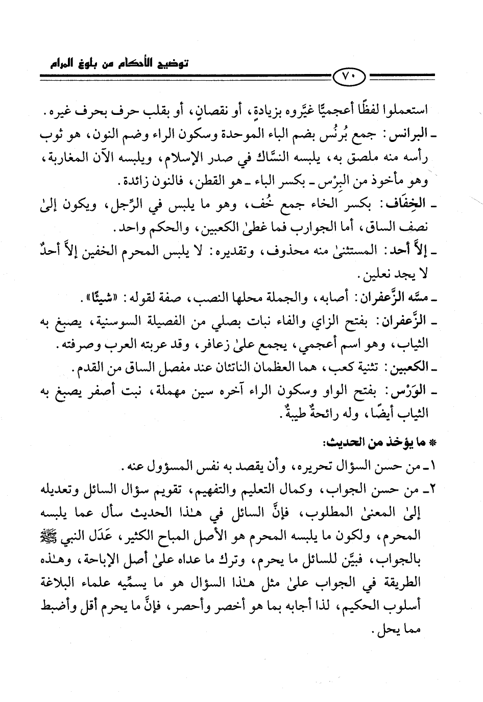 2 - من حسن الجواب، وكمال التعليم والتفهيم، تقويم سؤال السائل وتعديله إلى المعنى المطلوب، فإنَّ السائل في هذا الحديث سأل عما يلبسه المحرم، ولكون ما يلبسه المحرم هو الأصل المباح الكثير، عَدَل النبي -صلى الله عليه وسلم- بالجواب، فبيَّن للسائل ما يحرم، وترك ما عداه على أصل الإباحة، وهذه الطريقة في الجواب على مثل هلذا السؤال هو ما يسمِّيه علماء البلاغة أسلوب الحكيم، لذا أجابه بما هو أخصر وأحصر، فإنَّ ما يحرم أقل وأضبط مما يحل.