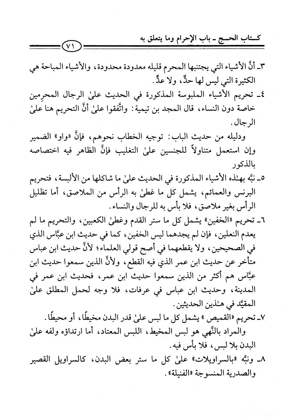 8 - ونبَّه "بالسراويلات" على كل ما ستر بعض البدن، كالسراويل القصير والصدرية المنسوجة "الفنيلة".