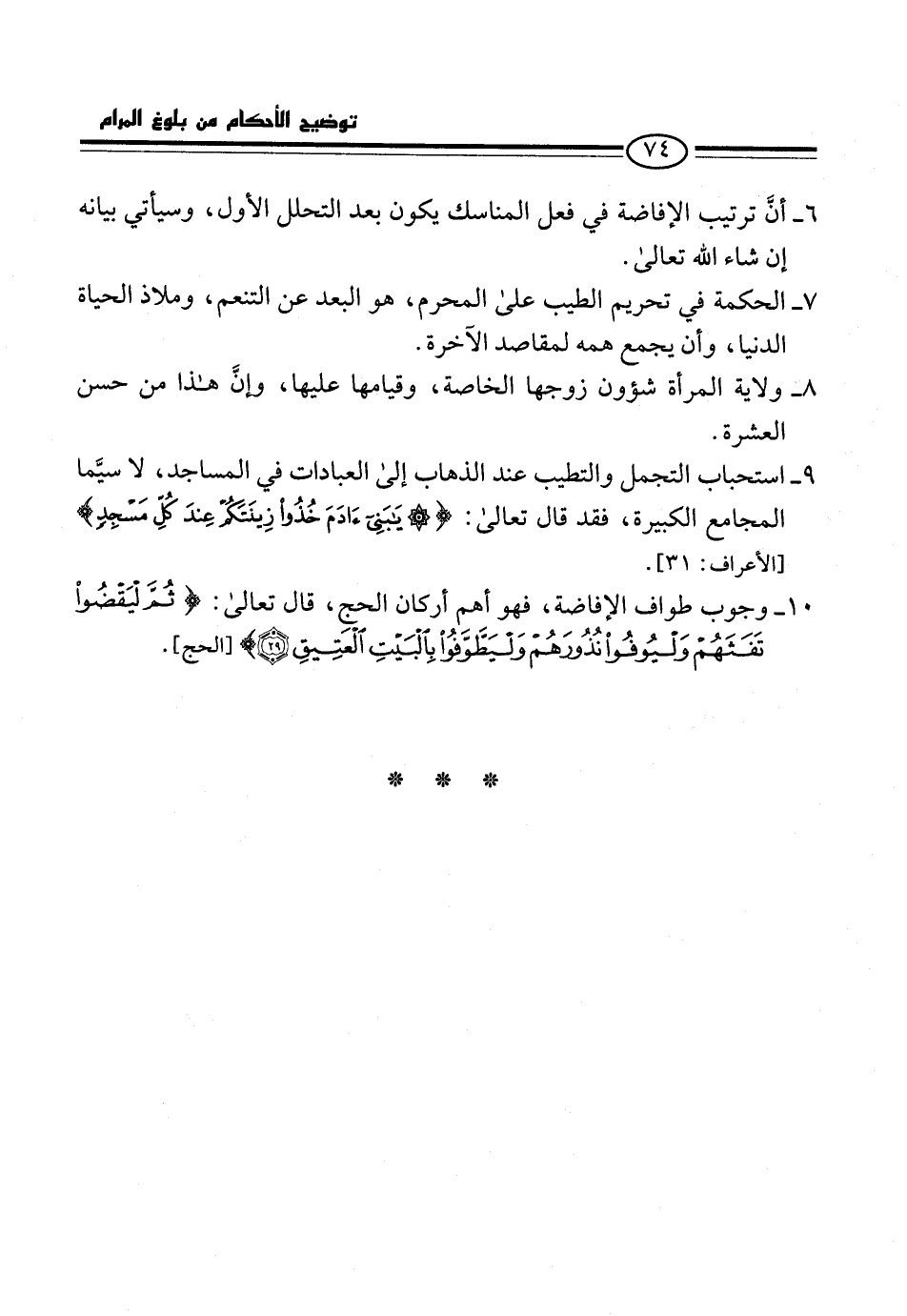 7 - الحكمة في تحريم الطيب على المحرم، هو البعد عن التنعم، وملاذ الحياة الدنيا، وأن يجمع همه لمقاصد الآخرة.