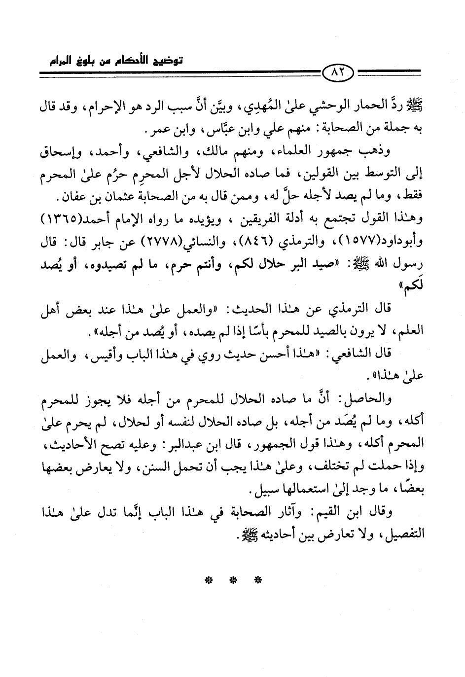 -صلى الله عليه وسلم- ردَّ الحمار الوحشي على المُهدِي، وبيَّن أنَّ سبب الرد هو الإحرام، وقد قال به جملة من الصحابة: منهم علي وابن عبَّاس، وابن عمر.