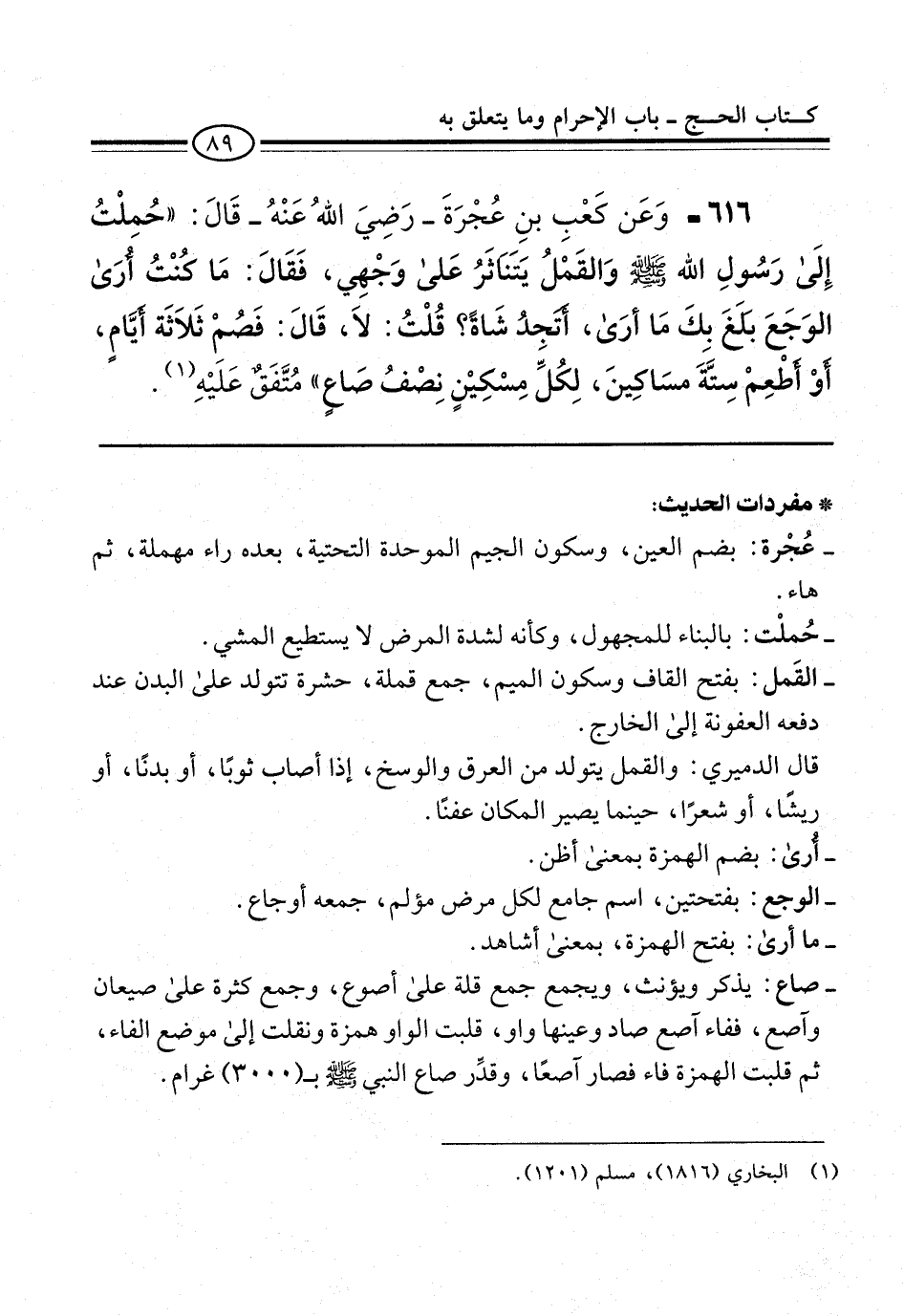 616 - وَعَن كَعْبِ بنِ عُجْرَةَ -رَضِيَ اللهُ عَنْهُ- قَالَ: "حُمِلْتُ إِلَى رَسُولِ الله -صلى الله عليه وسلم- والقَمْلُ يَتَنَاثَرُ عَلى وَجْهِي، فَقَالَ: مَا كُنْتُ أُرَى الوَجَعَ بلَغَ بِكَ مَا أرَى، أَتَجِدُ شَاةً؟ قُلْتُ: لَا، قَالَ: فَصُمْ ثَلَاثَة أَيَّامٍ، أَوْ أَطْعِمْ سِتَّةَ مسَاكينَ، لِكُلِّ مِسْكِيْنٍ نِصْفُ صَاعٍ" مُتَّفَقٌ عَلَيْهِ (¬1).