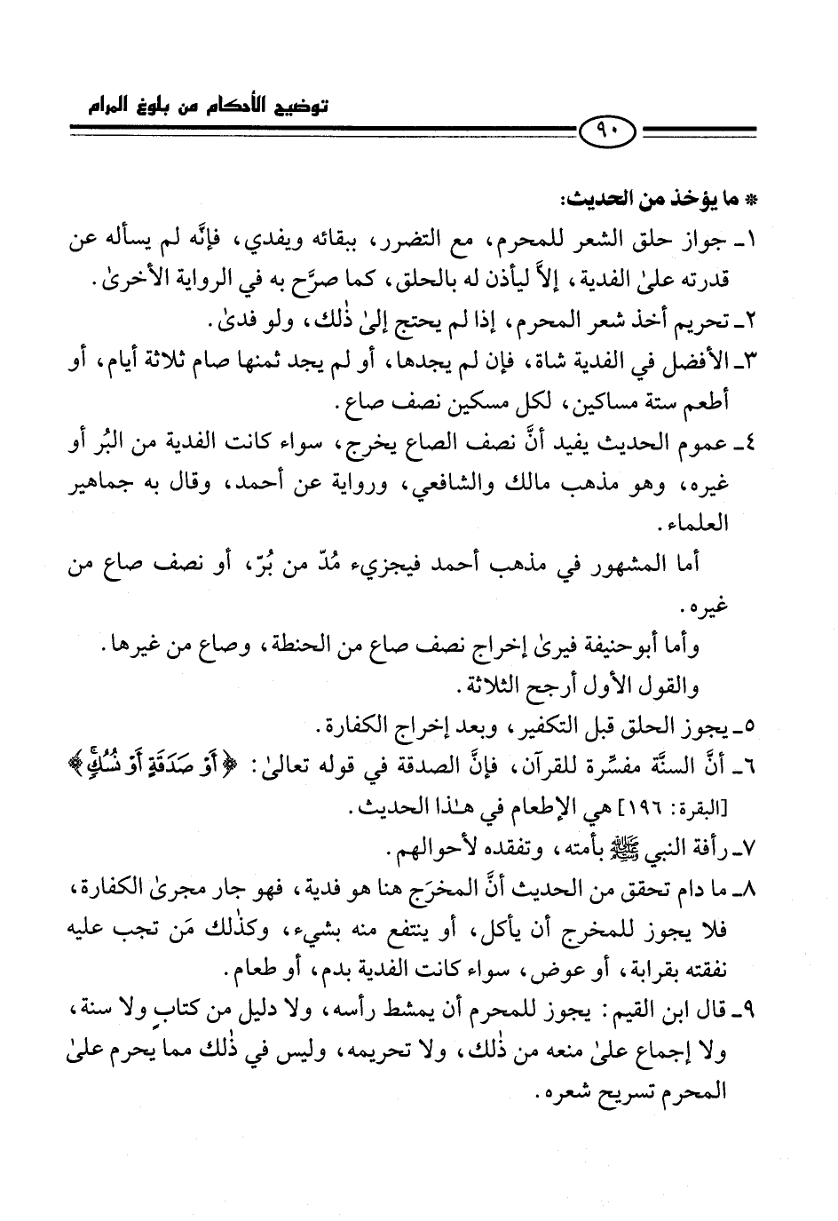 9 - قال ابن القيم: يجوز للمحرم أن يمشط رأسه، ولا دليل من كتابٍ ولا سنة، ولا إجماع على منعه من ذلك، ولا تحريمه، وليس في ذلك مما يحرم على المحرم تسريح شعره.