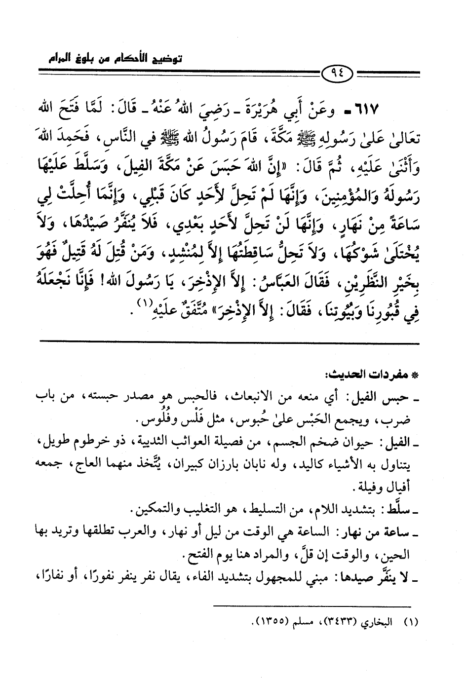 617 - وعَنْ أَبِي هُرَيْرَةَ -رَضِيَ اللهُ عَنْهُ- قَالَ: لَمَّا فَتَحَ الله تعَالى عَلى رَسُولِهِ -صلى الله عليه وسلم- مكَّةَ، قَامَ رَسُولُ الله -صلى الله عليه وسلم- في النَّاسِ، فَحَمِدَ اللهَ وَأَثْنَى عَلَيْهِ، ثُمَّ قَالَ: "إِنَّ اللهَ حَبَسَ عَنْ مَكَّةَ الفِيلَ، وَسلَّطَ عَلَيْهَا رَسُولَهُ وَالمُؤْمِنِينَ، وَإنَّهَا لَمْ تَحِلَّ لأَحَدٍ كَانَ قَبْلِي، وَإِنَّمَا أُحِلَّتْ لِي سَاعَةً مِنْ نَهَارٍ، وَإِنَّهَا لَنْ تَحِلَّ لأَحَدٍ بَعْدِي، فَلَا يُنَفَّرُ صَيدُهَا، وَلَا يُخْتَلَى شَوْكُهَا، وَلَا تَحِلُّ سَاقِطَتُهَا إِلَّا لِمُنْشِدٍ، وَمَنْ قُتِلَ لَهُ قَتِيلٌ فَهُوَ بِخَيْرِ النَّظَرِيْنِ، فَقَالَ العَبَّاسُ: إلاَّ الإِذْخِرَ، يَا رَسُولَ الله! فَإنَّا نَجْعَلَهُ فِي قُبُورِنَا وَبُيُوتِنَا، فَقَالَ: إِلَّا الإِذْخِرَ" مُتَّفَقٌ علَيْهِ (¬1).