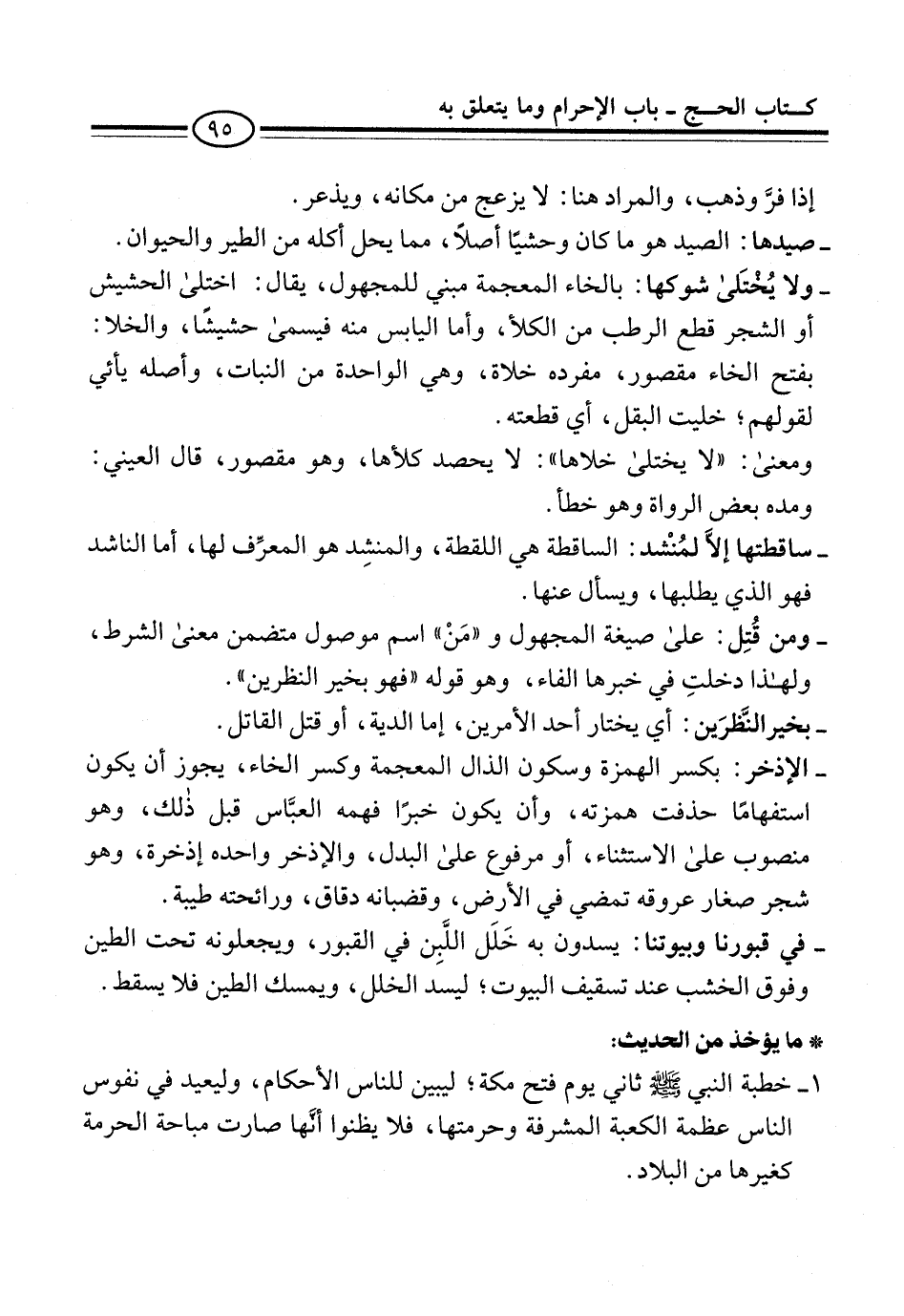 - ولا يُخْتَلى شوكها: بالخاء المعجمة مبني للمجهول، يقال: اختلى الحشيش أو الشجر قطع الرطب من الكلأ، وأما اليابس منه فيسمى حشيشًا، والخلا: بفتح الخاء مقصور، مفرده خلاة، وهي الواحدة من النبات، وأصله يأتي لقولهم؛ خليت البقل، أي قطعته.