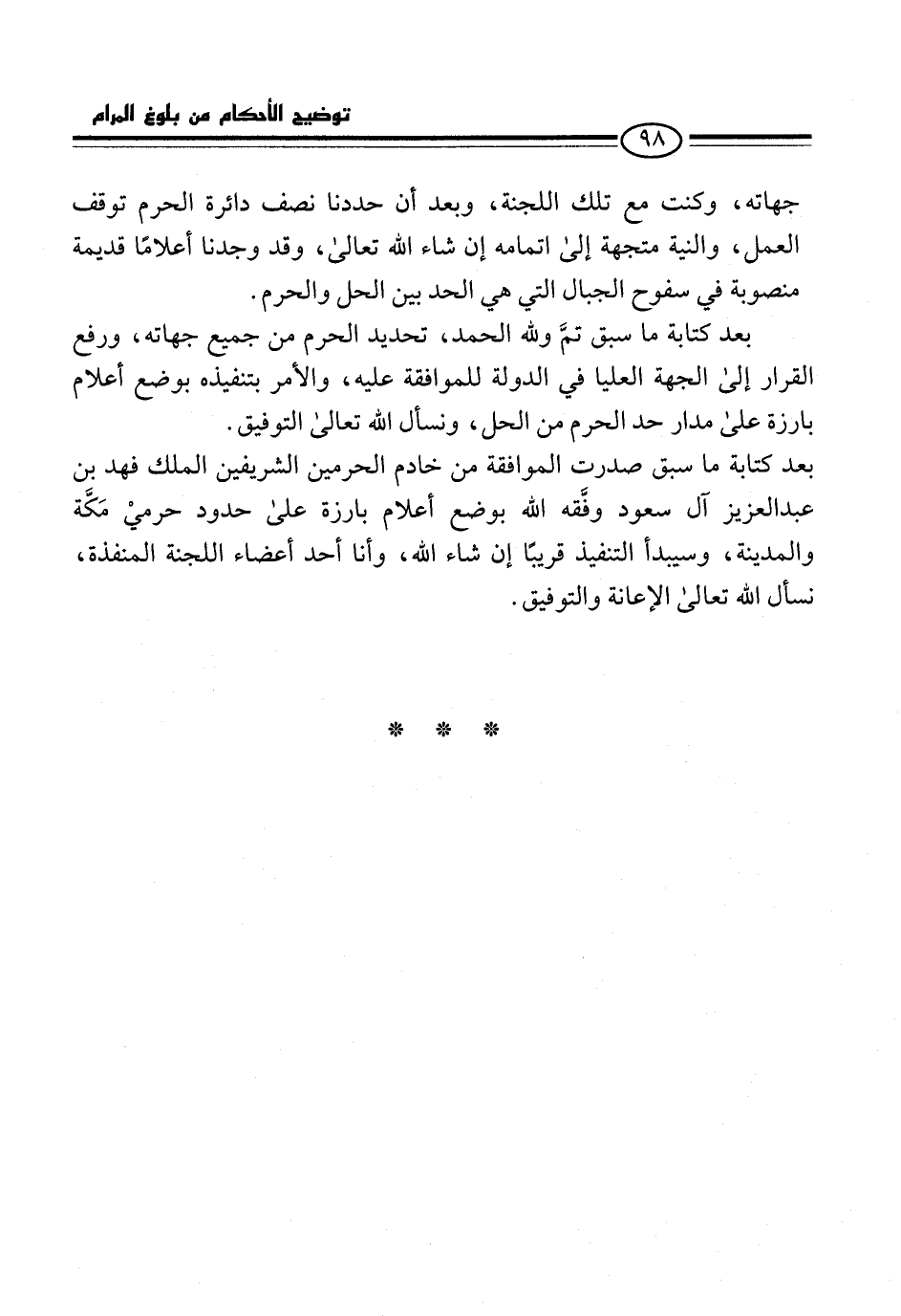 بعد كتابة ما سبق تمَّ ولله الحمد، تحديد الحرم من جميع جهاته، ورفع القرار إلى الجهة العليا في الدولة للموافقة عليه، والأمر بتنفيذه بوضع أعلام بارزة على مدار حد الحرم من الحل، ونسأل الله تعالى التوفيق.