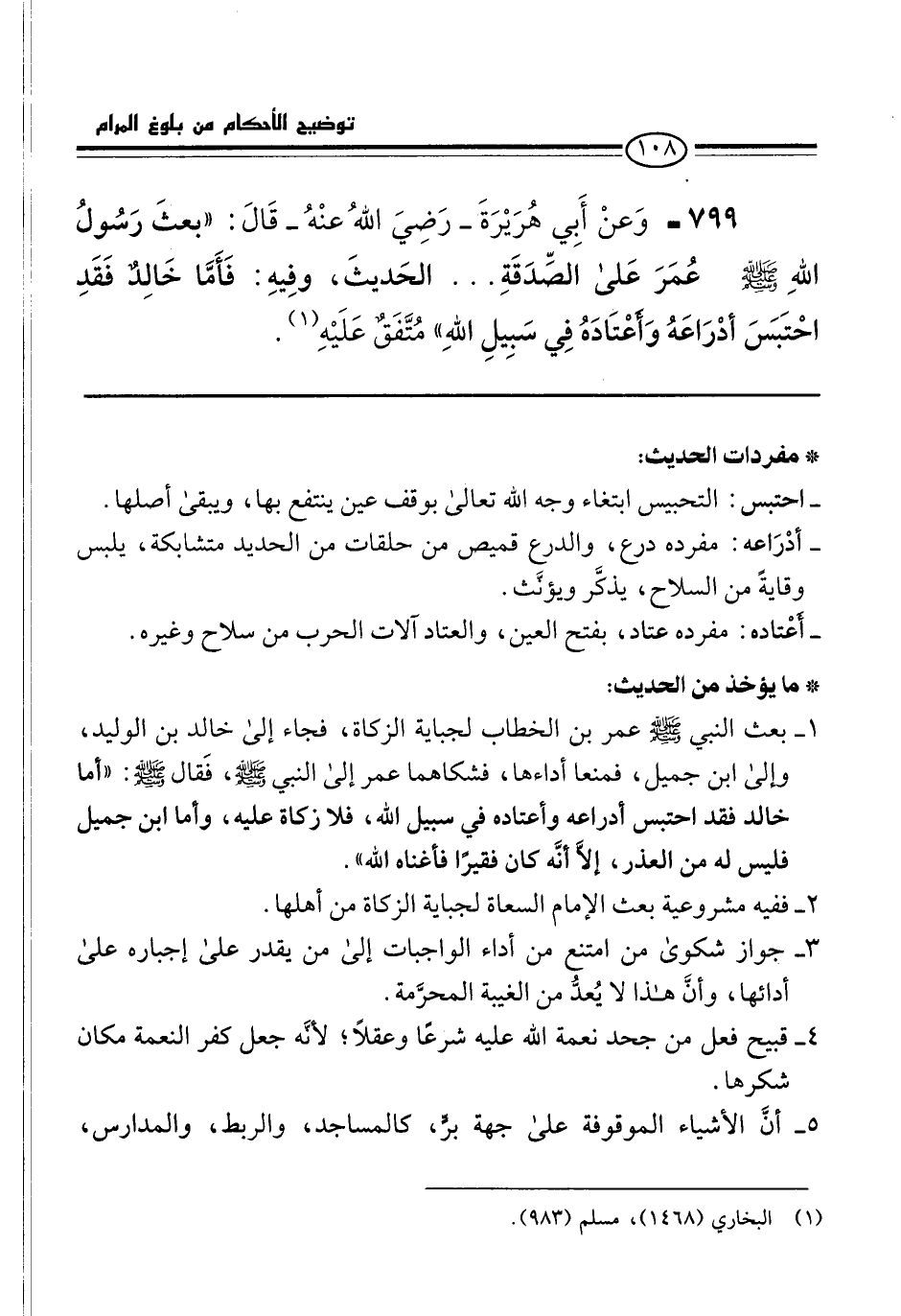 799 - وَعنْ أَبِي هُرَيْرَةَ -رَضِيَ اللهُ عنْهُ- قَالَ: "بعثَ رَسُولُ اللهِ -صلى الله عليه وسلم- عُمَرَ عَلى الصَّدَقَةِ ... الحَديثَ، وفِيهِ: فَأَمَّا خَالِدٌ فَقَدِ احْتَبَسَ أدْرَاعَهُ وَاعْتَادَهُ فِي سَبِيلِ اللهِ" مُتَّفَقٌ عَلَيْهِ (¬1).