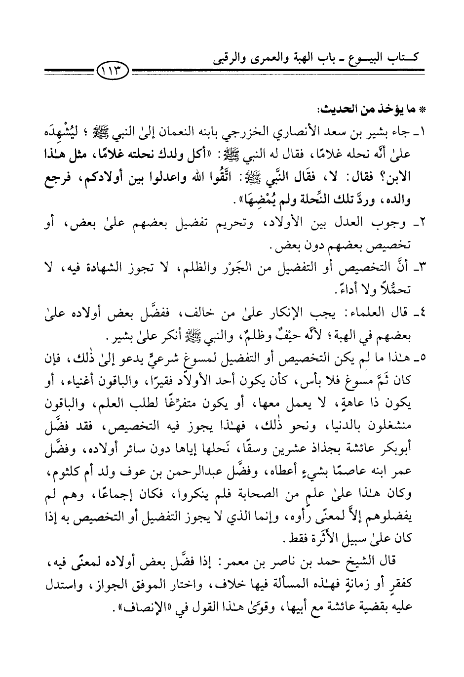 1 - جاء بشير بن سعد الأنصاري الخزرجي بابنه النعمان إلى النبي -صلى الله عليه وسلم-؛ ليُشْهِدَه على أنَّه نحله غلامًا، فقال له النبي -صلى الله عليه وسلم- "أكل ولدك نحلته غلامًا، مثل هذا الابن؟ فقال: لا، فقَال النَّبي-صلى الله عليه وسلم-: اتَّقُوا الله واعدلوا بين أولادكم, فرجع والده، وردَّ تلك النِّحلة ولم يُمْضِهَا".