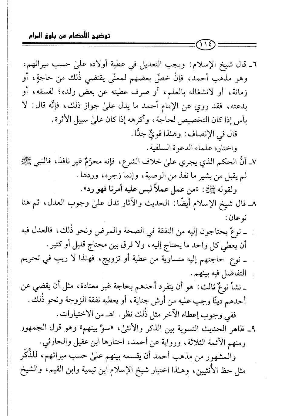 6 - قال شيخ الإسلام: ويجب التعديل في عطية أولاده على حسب ميراثهم، وهو مذهب أحمد، فإنْ خصَّ بعضهم لمعنًى يقتضي ذلك من حاجةٍ، أو زمانة، أو لانشغاله بالعلم، أو صرف عطيته عن بعض ولده؛ لفسقه، أو بدعته، فقد روي عن الإمام أحمد ما يدل على جواز ذلك، فإنَّه قال: لا بأس إذا كان التخصيص لحاجة، وأكرهه إذا كان على سبيل الأثرة.