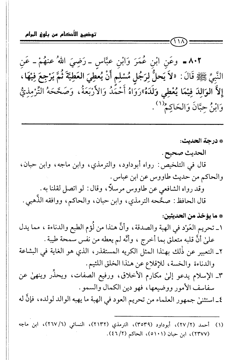 802 - وعَنِ ابْنِ عُمَرَ وَابْنِ عبَّاسٍ -رَضِيَ اللهُ عنهُمْ- عَنِ النَّبِيِّ -صلى الله عليه وسلم- قَالَ: "لاَ يَحلُّ لِرَجُلٍ مُسْلِمٍ أَنْ يُعطِيَ العَطِيَّةَ ثُمَّ يَرْجِعَ فِيْهَا، إِلاَّ الوَالِدَ فِيْمَا يُعْطِي وَلَدَهُ" رَوَاهُ أَحْمَدُ وَالأرْبَعَةُ، وَصَحَّحَهُ التِّرْمِذِيُّ وَابْنُ حِبَّانَ وَالحَاكِمُ (¬1).