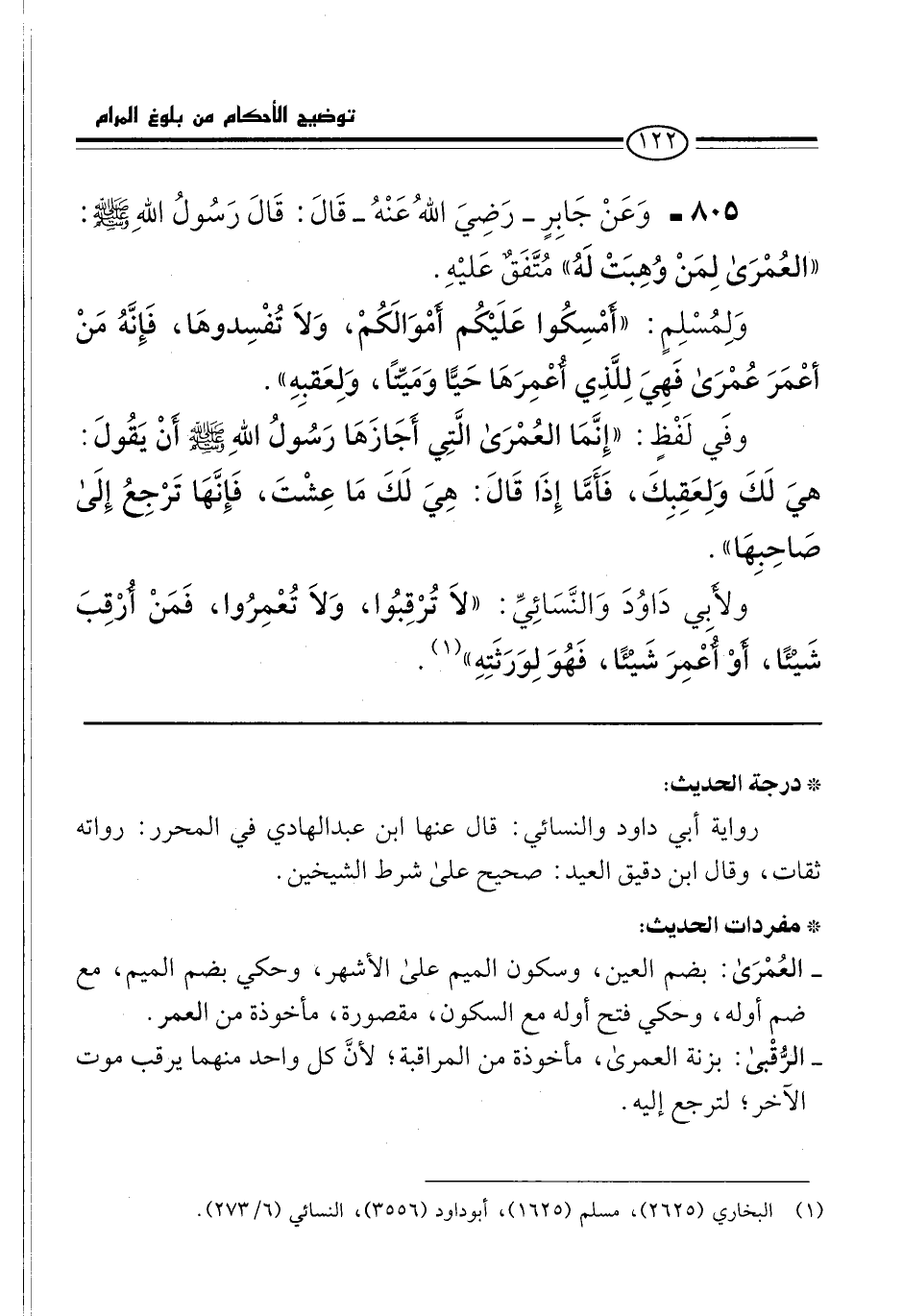 805 - وَعَنْ جَابِرٍ -رَضِيَ اللهُ عَنْهُ- قَالَ: قَالَ رَسُولُ اللهِ -صلى الله عليه وسلم- "العُمْرَى لِمَنْ وُهِبَتْ لَهُ" مُتَّفَقٌ عَليْهِ.