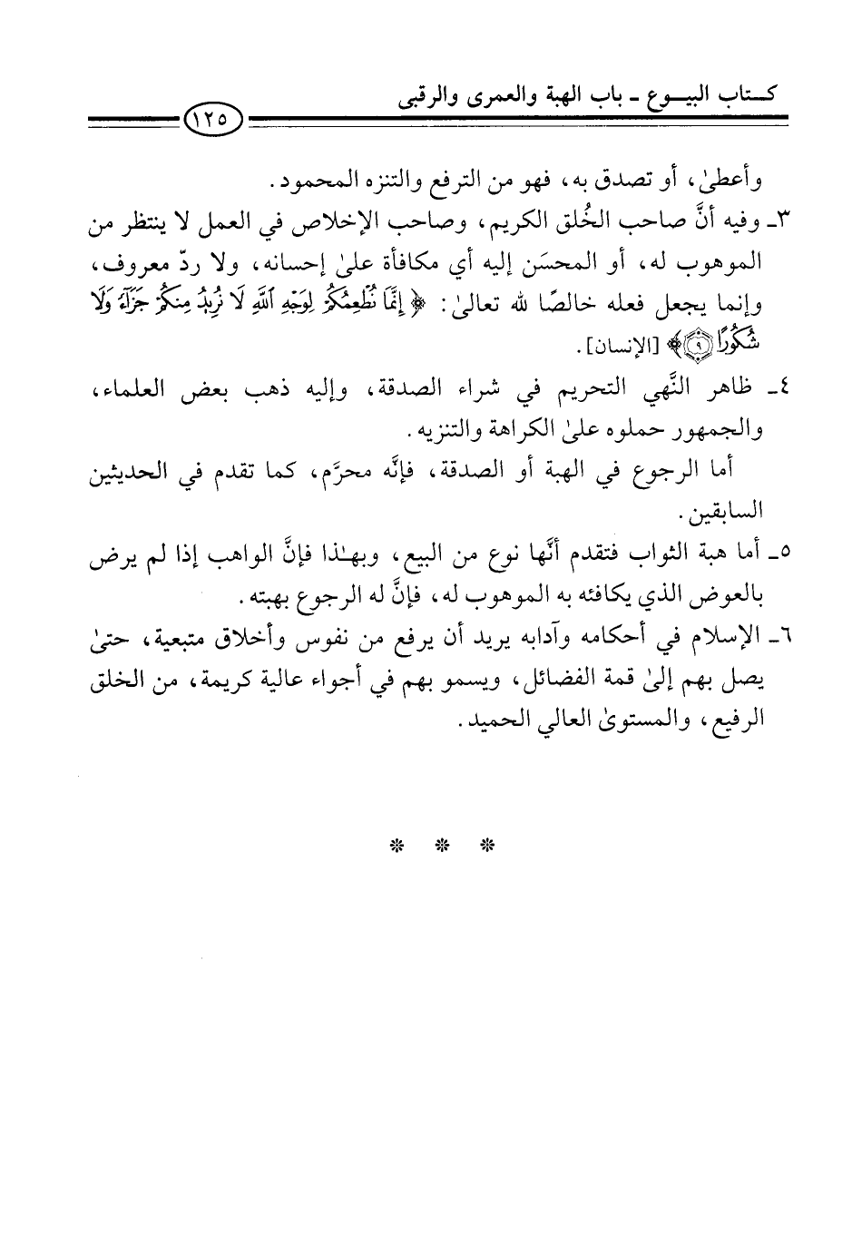 3 - وفيه أنَّ صاحب الخُلق الكريم، وصاحب الإخلاص في العمل لا ينتظر من الموهوب له، أو المحسَن إليه أي مكافأة على إحسانه، ولا ردّ معروف، وإنما يجعل فعله خالصًا لله تعالى: {إِنَّمَا نُطْعِمُكُمْ لِوَجْهِ اللَّهِ لَا نُرِيدُ مِنْكُمْ جَزَاءً وَلَا شُكُورًا (9)} [الإنسان].