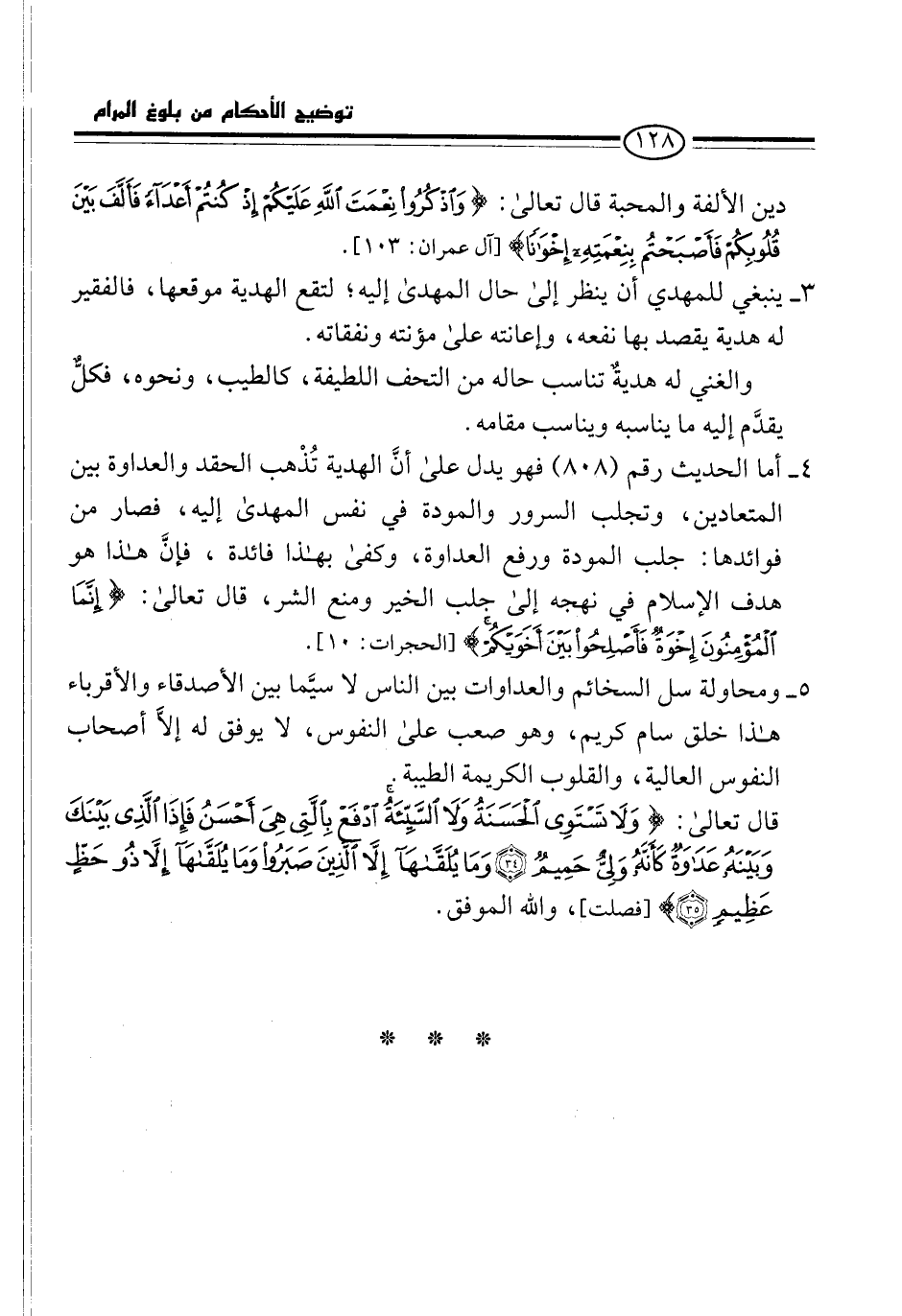 4 - أما الحديث رقم (808) فهو يدل على أنَّ الهدية تُذْهب الحقد والعداوة بين المتعادين، وتجلب السرور والمودة في نفس المهدي إليه، فصار من فوائدها: جلب المودة ورفع العداوة، وكفى بهذا فائدة، فإنَّ هذا هو هدف الإِسلام في نهجه إلى جلب الخير ومنع الشر، قال تعالى: {إِنَّمَا الْمُؤْمِنُونَ إِخْوَةٌ فَأَصْلِحُوا بَيْنَ أَخَوَيْكُمْ} [الحجرات: 10].