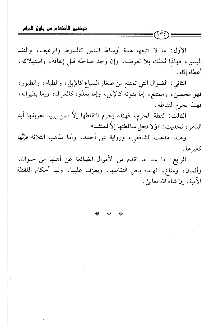 الرابع: ما عدا ما تقدم من الأموال الضائعة عن أهلها من حيوان، وأثمان، ومتاع، فهذه يحل التقاطها، ويعرَّف عليها, ولها أحكام اللقطة الآتية، إن شاء الله تعالى.