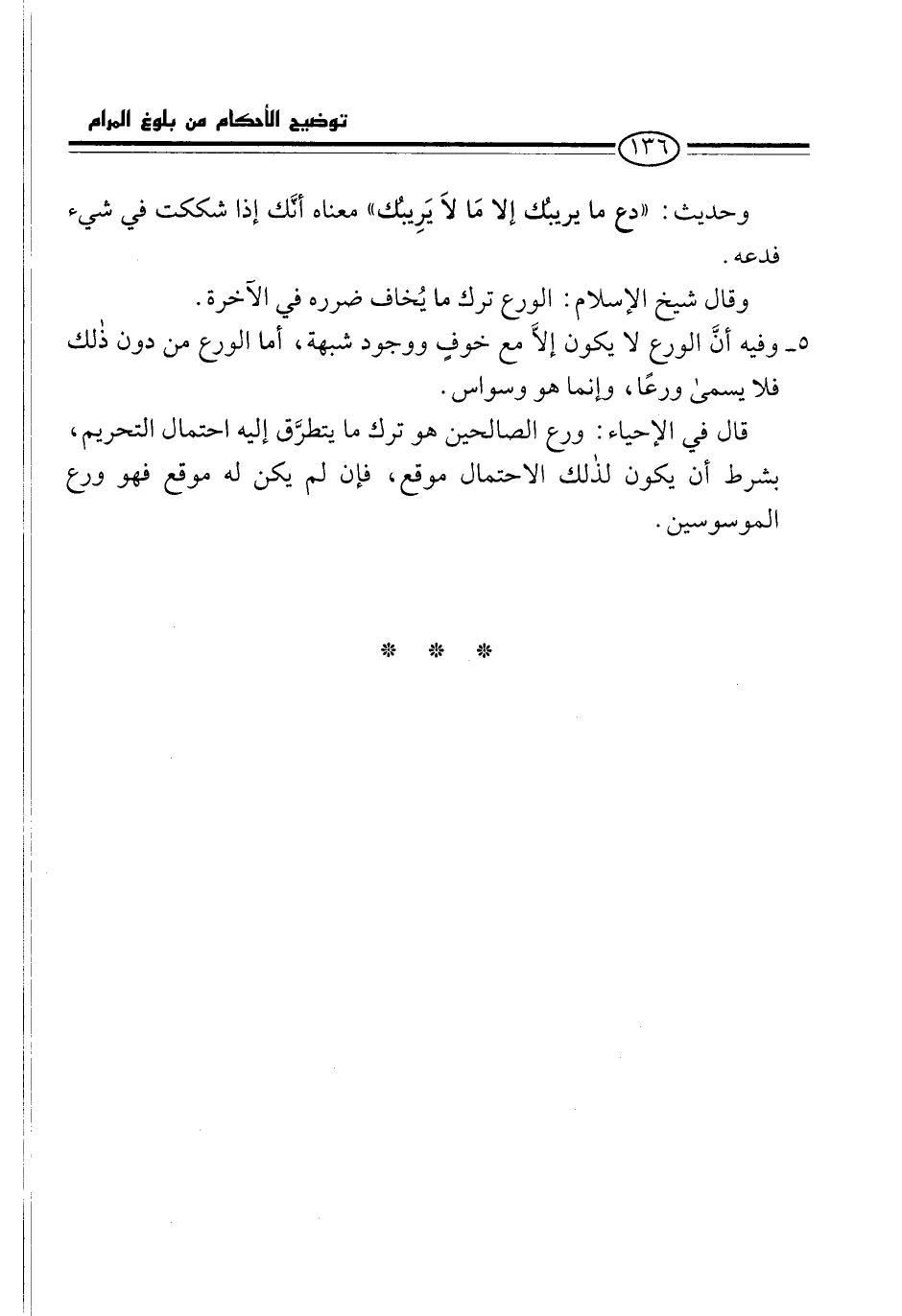 قال في الإحياء: ورع الصالحين هو ترك ما يتطرق إليه احتمال التحريم، بشرط أن يكون لذلك الاحتمال موقع، فإن لم يكن له موقع فهو ورع الموسوسين.
