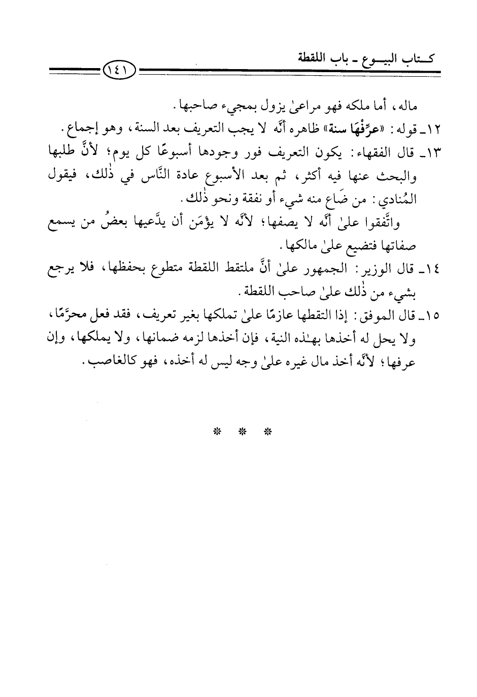 14 - قال الوزير: الجمهور على أنَّ ملتقط اللقطة متطوع بحفظها، فلا يرجع بشيء من ذلك على صاحب اللقطة.
