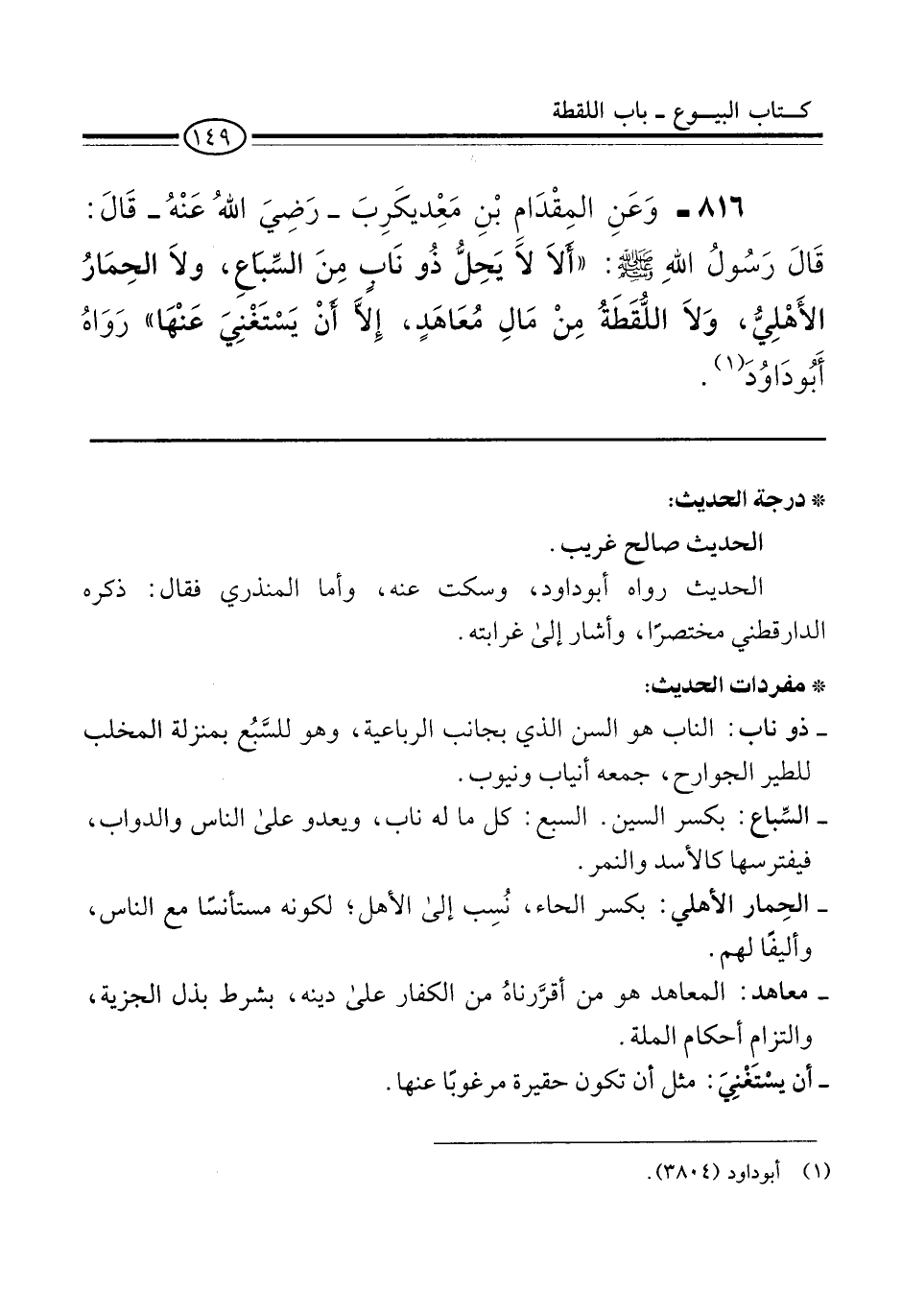 816 - وَعَنِ المِقْدَامِ بْنِ مَعديكَرِبَ -رَضِيَ اللهُ عَنْهُ- قَالَ: قَالَ رَسولُ اللهِ -صلى الله عليه وسلم-: "ألاَ لاَ يَحِلُّ ذُو نَابٍ مِنَ السِّبَاعِ، ولاَ الحِمَارُ الأَهْلِيُّ، وَلاَ اللُّقَطَةُ مِنْ مَالِ مُعَاهَدٍ، إِلاَّ أَنْ يَسْتَغْنِيَ عَنْهَا" رَوَاهُ أَبُو دَاوُدَ (¬1).