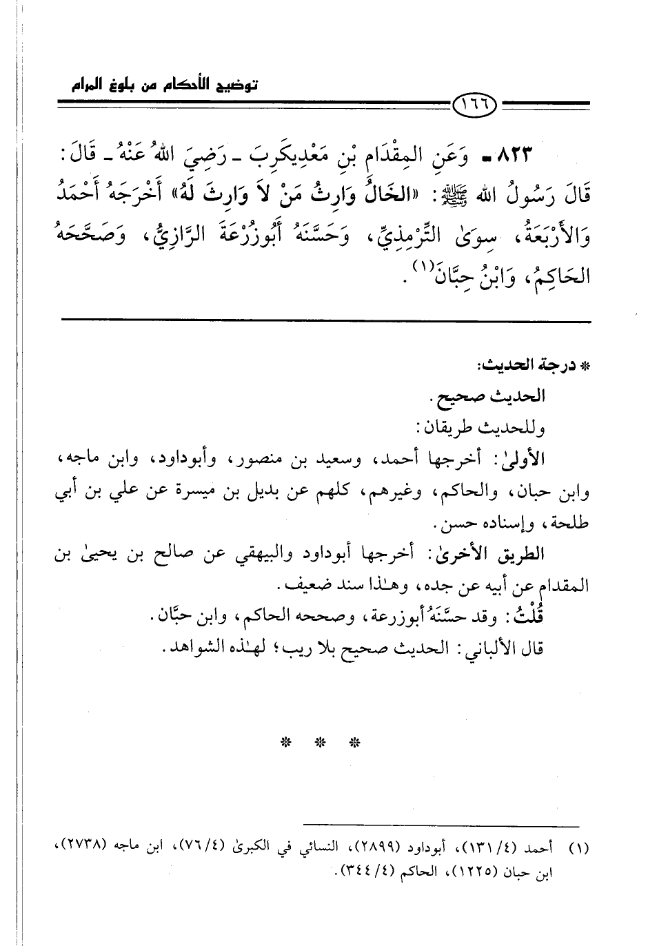 823 - وَعَنِ المِقْدَامِ بْنِ مَعْدِيكَرِبَ -رَضِيَ اللهُ عَنْهُ- قَالَ: قَالَ رَسُولُ الله -صلى الله عليه وسلم-: "الخَالُ وَارِثُ مَنْ لاَ وَارِثَ لَه" أَخْرَجَهُ أَحْمَدُ وَالأرْبَعَةُ، سِوَى التِّرْمِذِيِّ، وَحَسَّنَهُ أَبُو زُرْعَةَ الرَّازِيُّ، وَصَحَّحَهُ الحَاكِمُ، وَابْنُ حِبَّانَ (¬1).