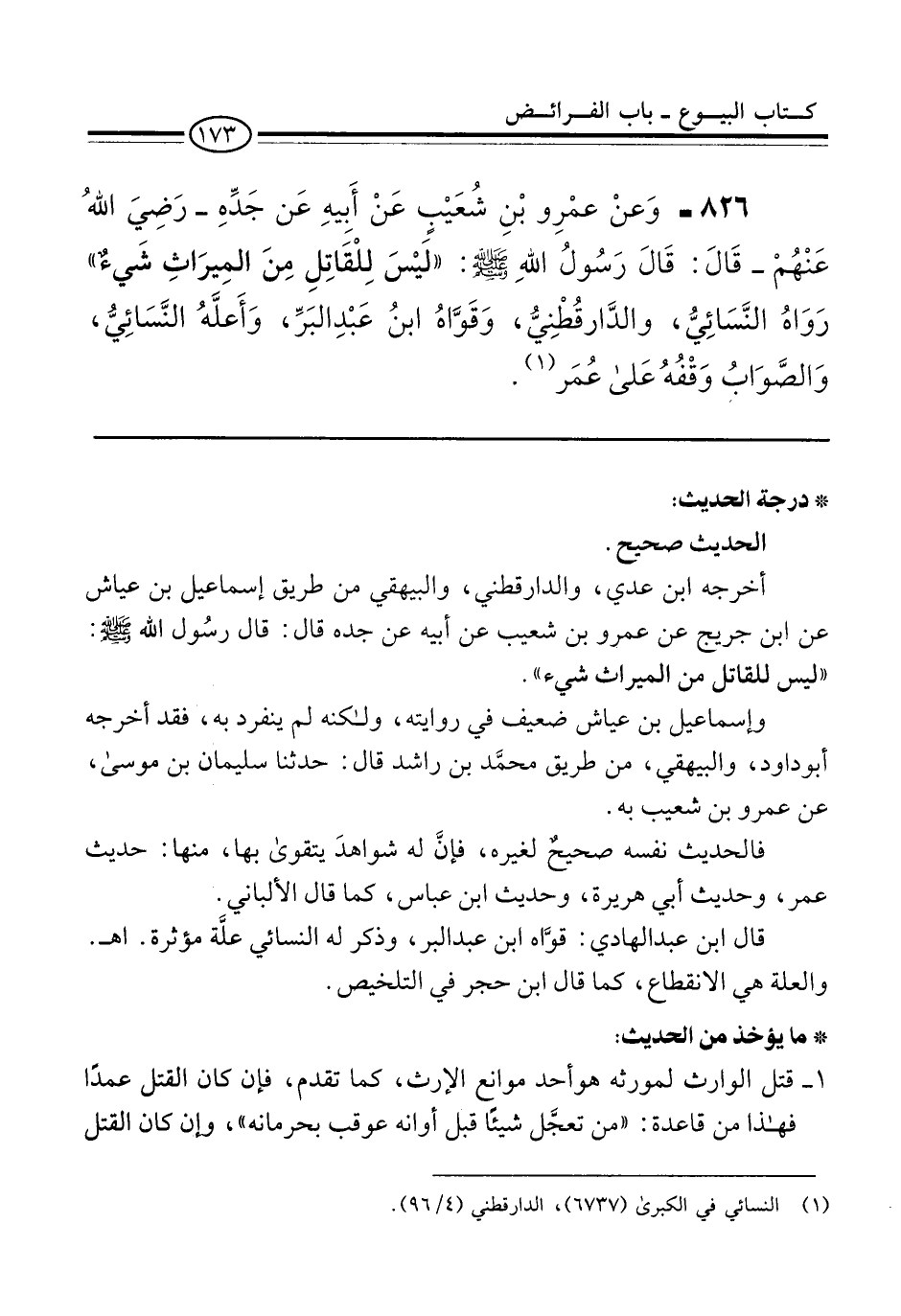 826 - وَعنْ عمْرِو بْنِ شُعَيْبٍ عَنْ أَبِيهِ عَن جَدِّهِ -رَضِيَ اللهُ عَنْهُمْ- قَالَ: قَالَ رَسُولُ اللهِ -صلى الله عليه وسلم-: "لَيْسَ لِلْقَاتِلِ مِنَ المِيرَاثِ شَيءٌ" رَوَاهُ النَّسَائِيُّ، والدَّارقُطْنِيُّ، وَقَوَّاهُ ابنُ عَبْدِ البَرِّ، وَأَعلَّهُ النَّسَائِيُّ، وَالصَّوَابُ وَقْفُهُ عَلى عُمَر (¬1).