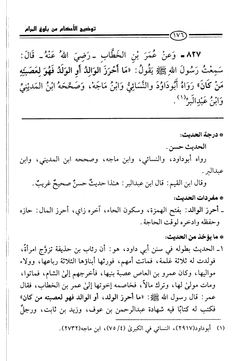 827 - وَعنْ عُمَرَ بْنِ الخَطَّابِ -رَضِيَ اللهُ عَنْهُ- قَالَ: سَمِعْتُ رَسُولَ اللهِ -صلى الله عليه وسلم- يَقُولُ: "مَا أحْرَزَ الوَالِدُ أوِ الوَلَدُ فَهُوَ لِعَصَبَتِهِ مَنْ كَانَ" رَوَاهُ أَبُو دَاوُدَ والنَّسَائِيُّ وَابْنُ مَاجَهْ، وَصَحَّحَهُ ابْنُ المَديْنِيِّ وَابْنُ عَبْدِ البرِّ (¬1).