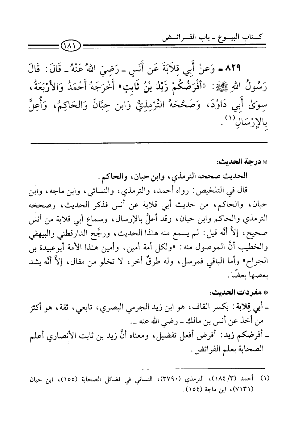 829 - وَعنْ أَبِي قِلاَبَةَ عَن أَنَسٍ -رَضِيَ اللهُ عَنْهُ- قَالَ: قَال رَسُولُ اللهِ -صلى الله عليه وسلم-: "أفْرَضُكُمْ زَيْدُ بْنُ ثَابِتٍ" أَخْرَجَهُ أَحْمَدُ وَالأرْبَعَةُ، سِوَى أِبي دَاوُدَ، وَصَحَّحَهُ التِّرْمِذِيُّ وَابن حِبَّانَ وَالحَاكِمُ، وَأُعِلَّ بِالإِرْسَالِ (¬1).