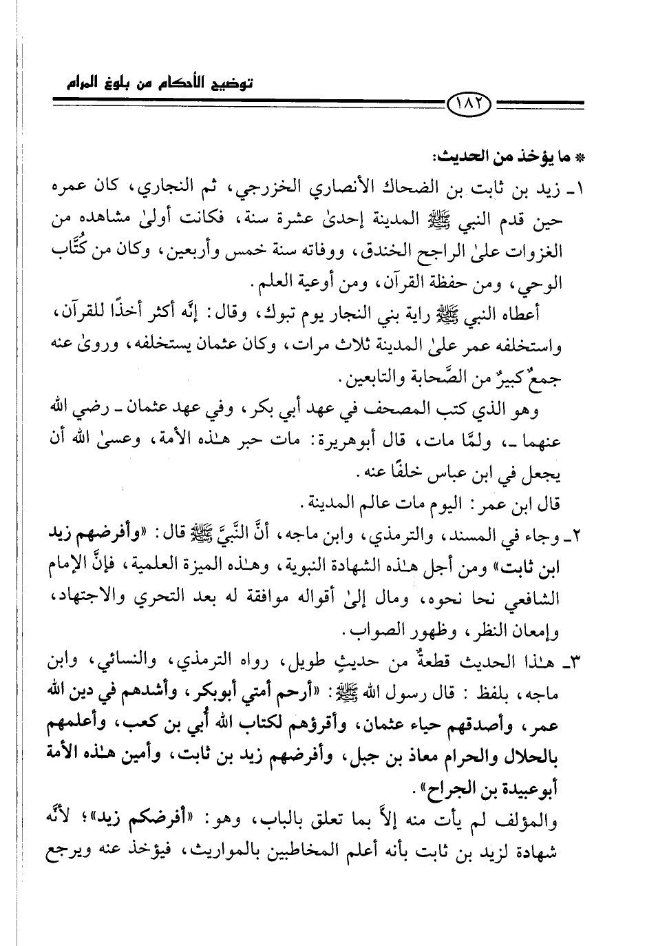 والمؤلف لم يأت منه إلاَّ بما تعلق بالباب، وهو: "أفرضكم زيد"؛ لأنَّه شهادة لزيد بن ثابت بأنه أعلم المخاطبين بالمواريث، فيؤخذ عنه ويرجع