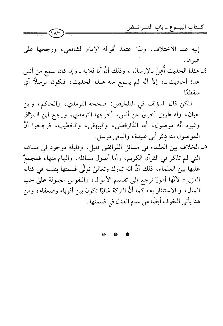 5 - الخلاف بين العلماء في مسائل الفرائض قليل، وقليله موجود في مسائله التي لم تذكر في القرآن الكريم، وأما أصول مسائله، والهام منها، فمجمعٌ عليها بين العلماء، ذلك أنَّ الله تبارك وتعالى تولَّى قسمتها بنفسه في كتابه العزيز؛ لأنَّها أمورٌ ترجع إلى تقسيم الأموال، والنفوس مجبولة على حب المال، والاستئثار به، كما أنَّ التركة غالبًا تكون بين أقوياء وضعفاء، ومن هنا يأتي الخوف أيضًا من عدم العدل في قسمتها.