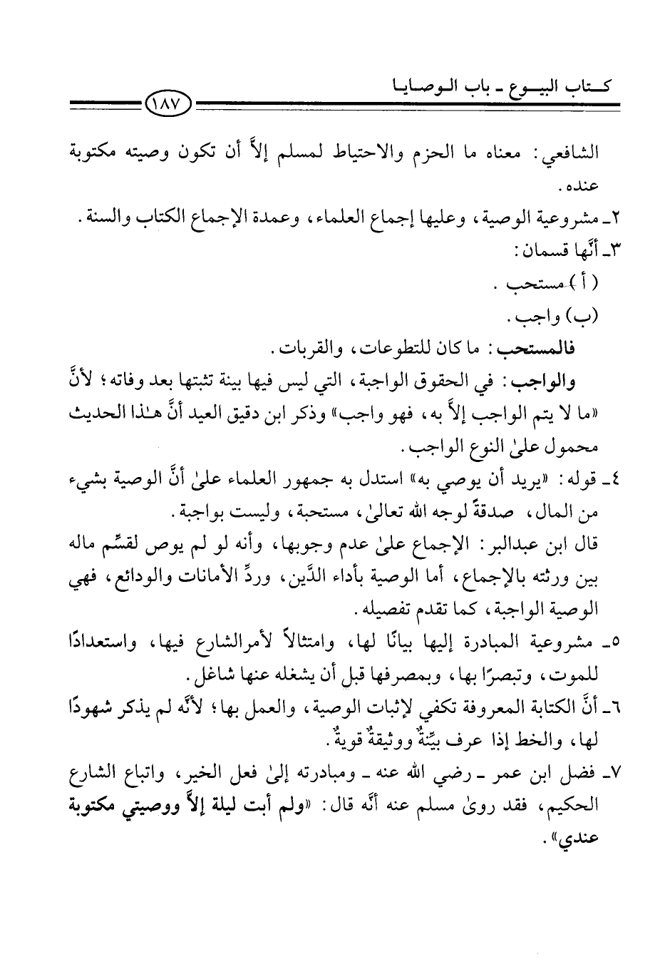 6 - أنَّ الكتابة المعروفة تكفي لإثبات الوصية، والعمل بها؛ لأنَّه لم يذكر شهودًا لها، والخط إذا عرف بيِّنةٌ ووثيقةٌ قويةٌ.
