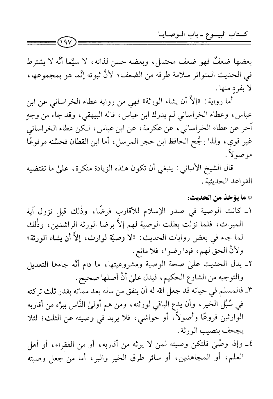 أما رواية: "إلاَّ أن يشاء الورثة" فهي من رواية عطاء الخراساني عن ابن عباس، وعطاء الخراساني لم يدرك ابن عباس، قاله البيهقي، وقد جاء من وجهٍ آخر عن عطاء الخراساني، عن عكرمة، عن ابن عباس، لكن عطاء الخراساني غير قوي، ولذا رجَّح الحافظ ابن حجر المرسل، أما ابن القطان فحسَّنه مرفوعًا موصولًا.