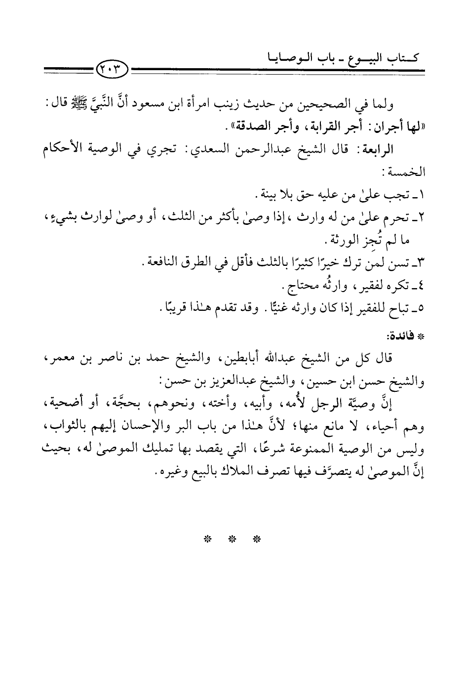 الرابعة: قال الشيخ عبد الرحمن السعدي: تجري في الوصية الأحكام الخمسة: