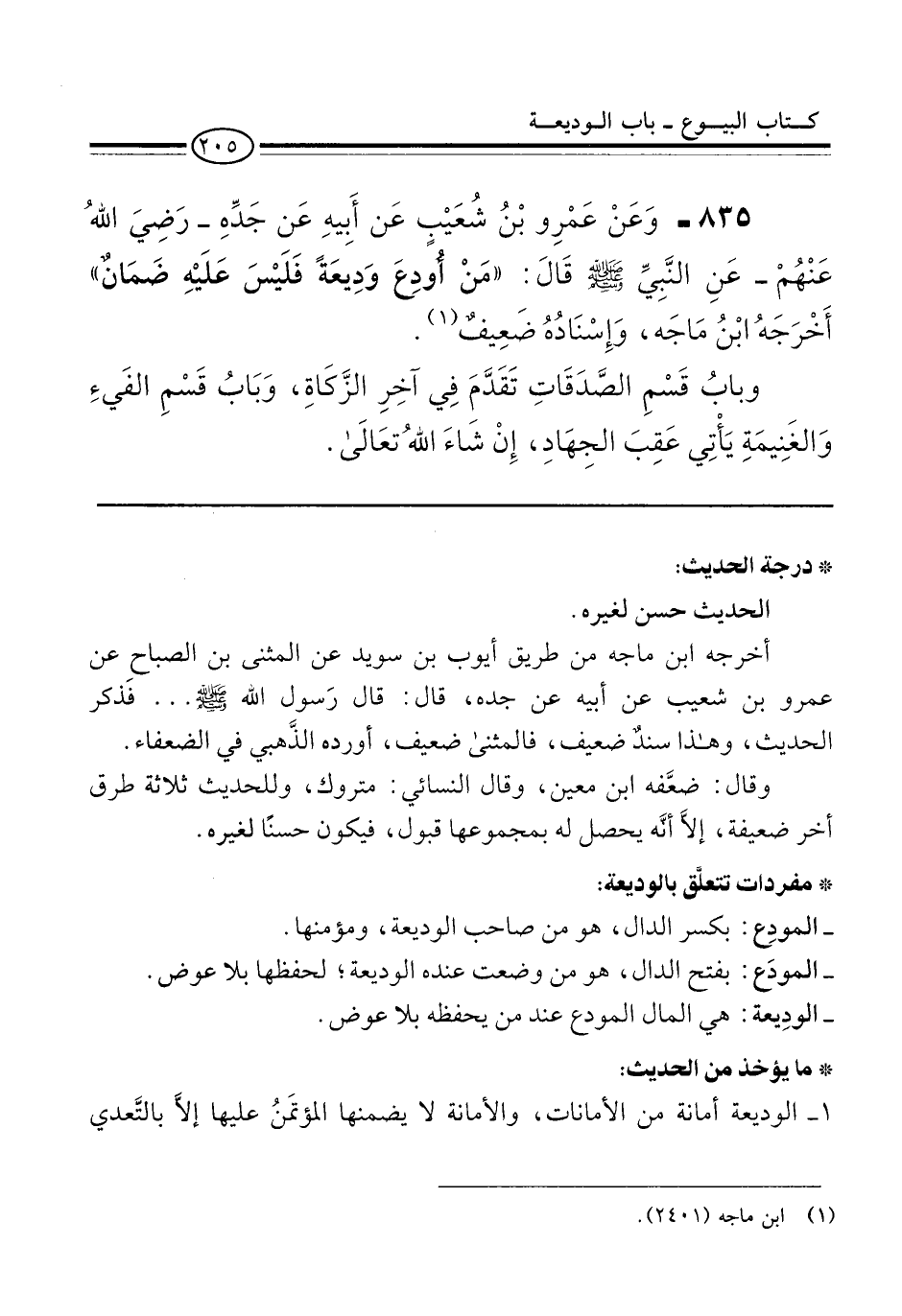 835 - وَعَنْ عَمْرِو بْنُ شُعَيْبٍ عَن أَبِيهِ عَن جَدِّهِ -رَضِيَ اللهُ عَنْهُمْ- عَنِ النَّبِيِّ -صلى الله عليه وسلم- قَالَ: "مَنْ أُودِعَ وَدِيعَةً فَلَيْسَ عَلَيْهِ ضَمَانٌ" أَخْرَجَهُ ابْنُ مَاجَه، وَإِسْنَادُهُ ضَعِيفٌ (¬1).