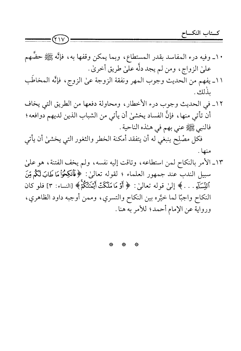 13 - الأمر بالنكاح لمن استطاعه، وتاقت إليه نفسه، ولم يخف الفتنة، هو على سبيل الندب عند جمهور العلماء؛ لقوله تعالى: {فَانْكِحُوا مَا طَابَ لَكُمْ مِنَ النِّسَاءِ ...} إلى قوله تعالى: {أَوْ مَا مَلَكَتْ أَيْمَانُكُمْ} [النساء: 3] فلو كان النكاح واجبًا لما خيَّره بين النكاح والتسري، وممن أوجبه داود الظاهري، ورواية عن الإِمام أحمد؛ للأمر به هنا.