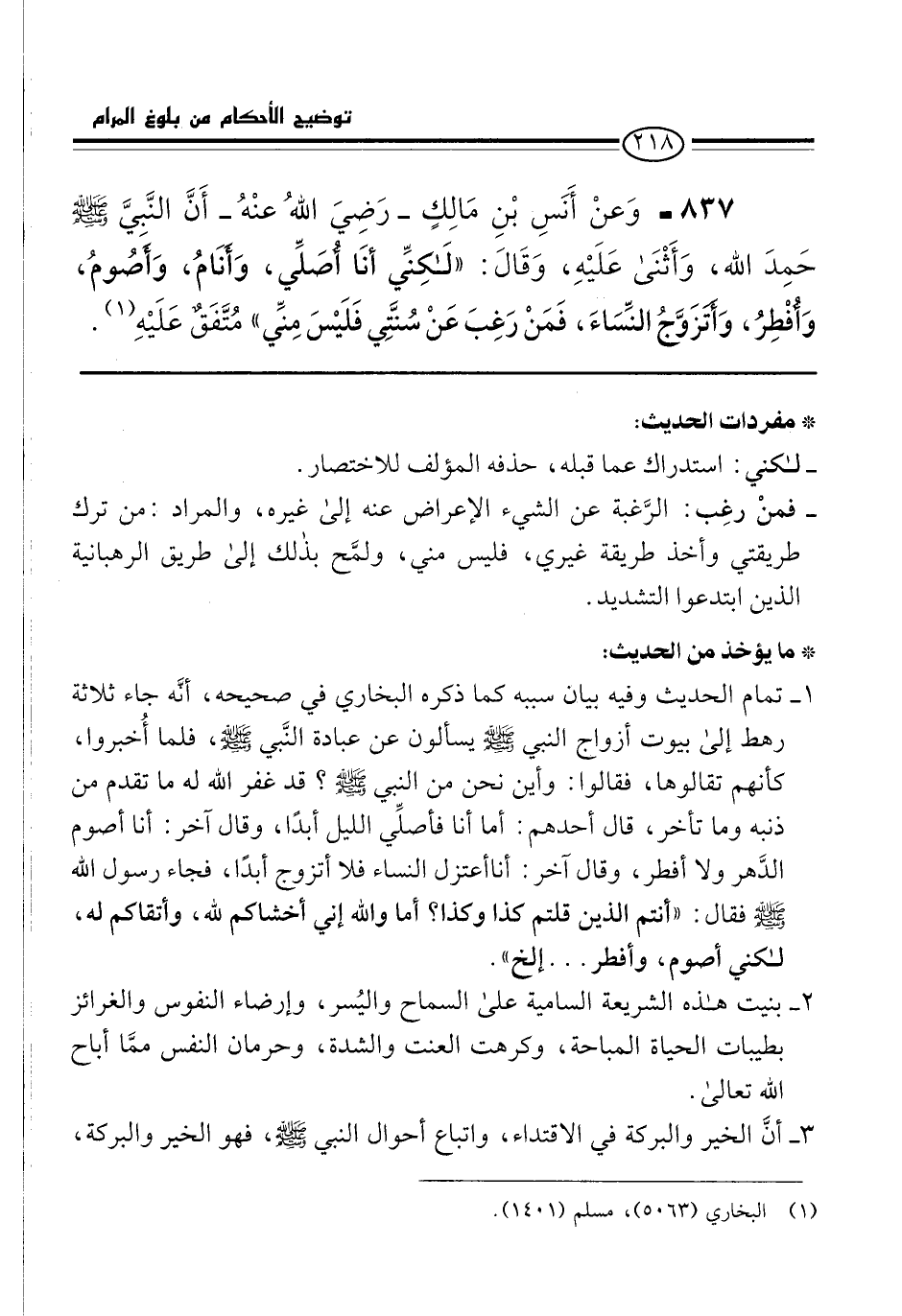 837 - وَعَنْ أَنَسِ بْنِ مَالِكٍ -رَضِيَ اللهُ عنْهُ- أَنَّ النَّبيَّ -صلى الله عليه وسلم- حَمِدَ الله، وَأَثْنَى عَلَيْهِ، وَقَالَ: "لَكِنَيِّ أنَا أصَلِّي، وَأنَامُ، وَأصُومُ، وَأُفْطِرُ، وَأَتَزَوَّجُ النِّسَاءَ، فَمَنْ رَغِبَ عَنْ سُنَّتِي فَلَيْسَ مِنِّي" مُتَّفَقٌ عَلَيْهِ (¬1).