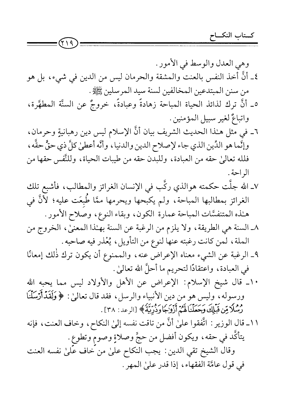 10 - قال شيخ الإِسلام: الإعراض عن الأهل والأولاد ليس مما يحبه الله ورسوله، وليس هو من دين الأنبياء والرسل، فقد قال تعالى: {وَلَقَدْ أَرْسَلْنَا رُسُلًا مِنْ قَبْلِكَ وَجَعَلْنَا لَهُمْ أَزْوَاجًا وَذُرِّيَّةً} [الرعد: 38].