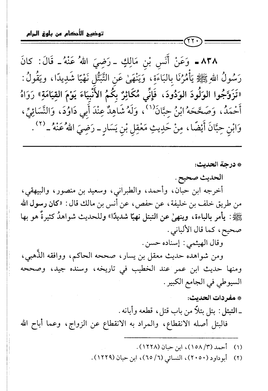 838 - وَعَنْ أَنَسِ بْنِ مَالِكٍ -رَضِيَ اللهُ عَنْهُ- قَالَ: كانَ رَسُولُ اللهِ -صلى الله عليه وسلم- يَأْمُرُنَا بِالبَاءَةِ، وَيَنْهَى عَنِ التَّبَتُّلِ نَهْيًا شَدِيدًا، ويَقُولُ: "تَزَوَّجُوا الوَلُودَ الوَدُودَ، فَإنِّي مُكَاثِرٌ بِكُمُ الأَنْبيَاءَ يَوْمَ القِيَامَةِ" رَوَاهُ أَحْمَدُ، وَصَحَّحَهُ ابْنُ حِبَّانَ (¬1)، وَلَهُ شَاهِدٌ عِنْدَ أبِي دَاوُدَ، وَالنَّسَائِيِّ، وَابْنِ حِبَّانَ أَيْضًا، مِنْ حَدِيثِ مَعْقِلِ بْنِ يَسَارٍ -رَضِيَ اللهُ عَنْهُ- (¬2).