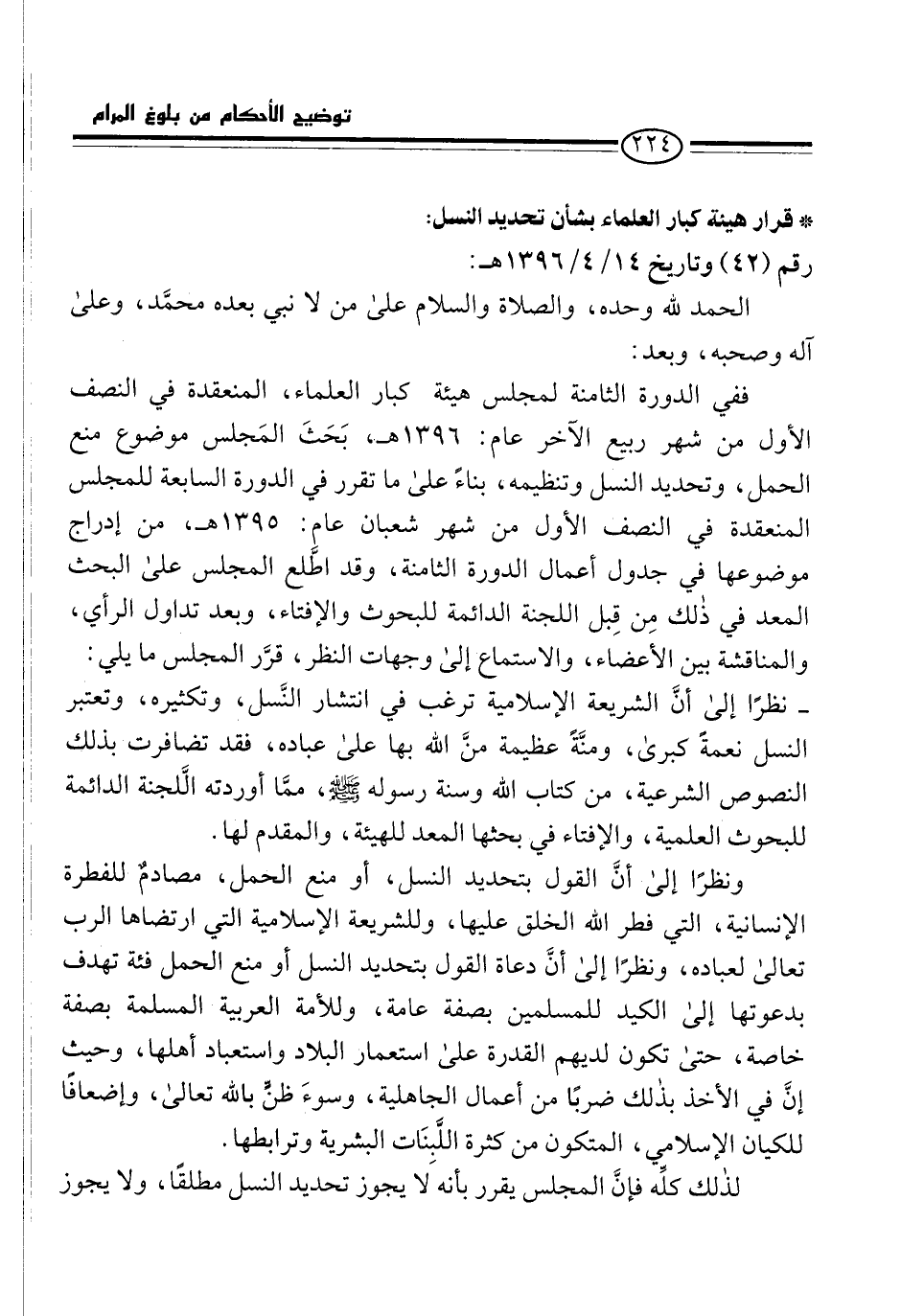 * قرار هيئة كبار العلماء بشأن تحديد النسل: رقم (42) وتاريح 14/ 4/ 1396 هـ:
