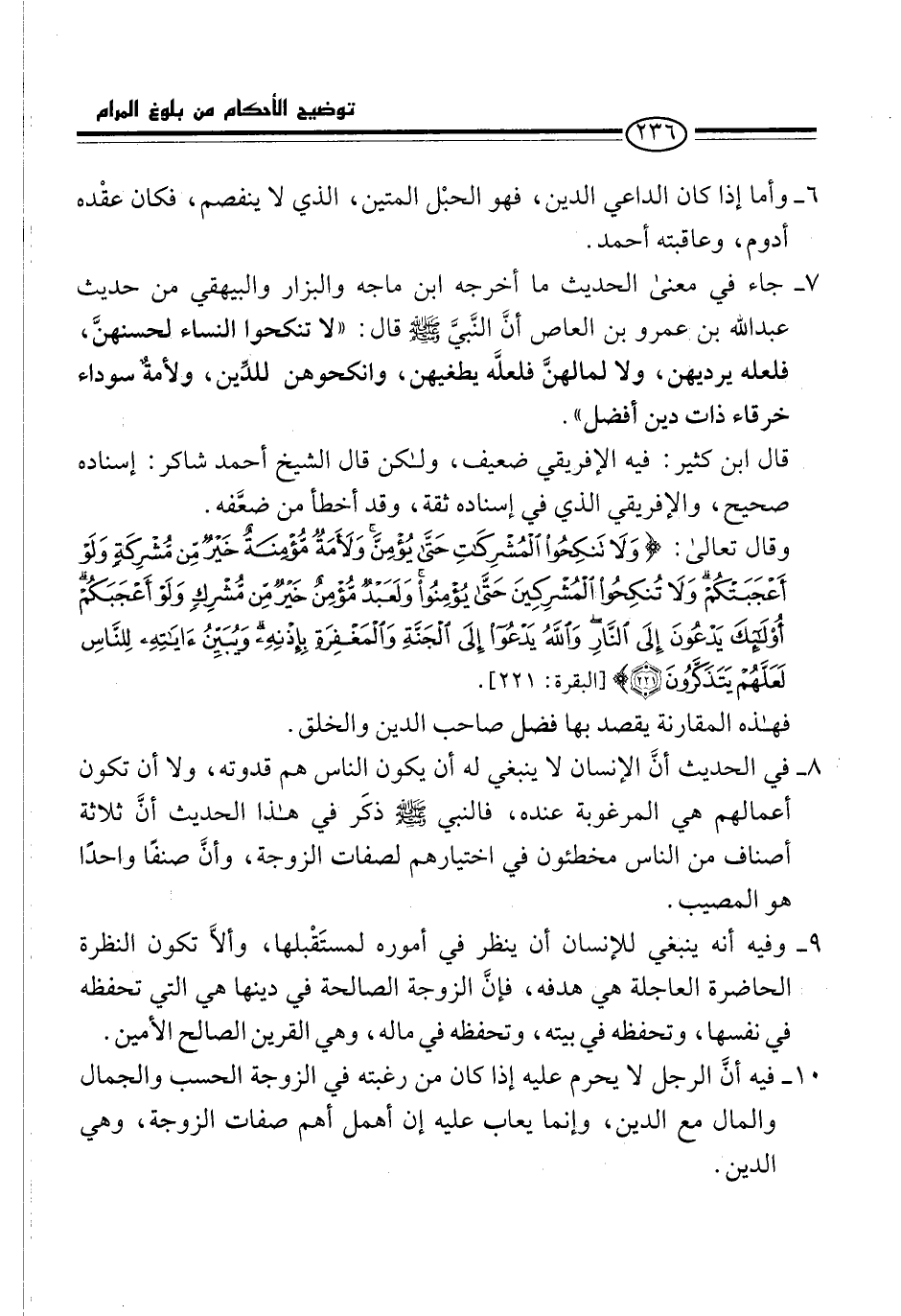 10 - فيه أنَّ الرجل لا يحرم عليه إذا كان من رغبته في الزوجة الحسب والجمال والمال مع الدين، وإنما يعاب عليه إن أهمل أهم صفات الزوجة، وهي الدين.