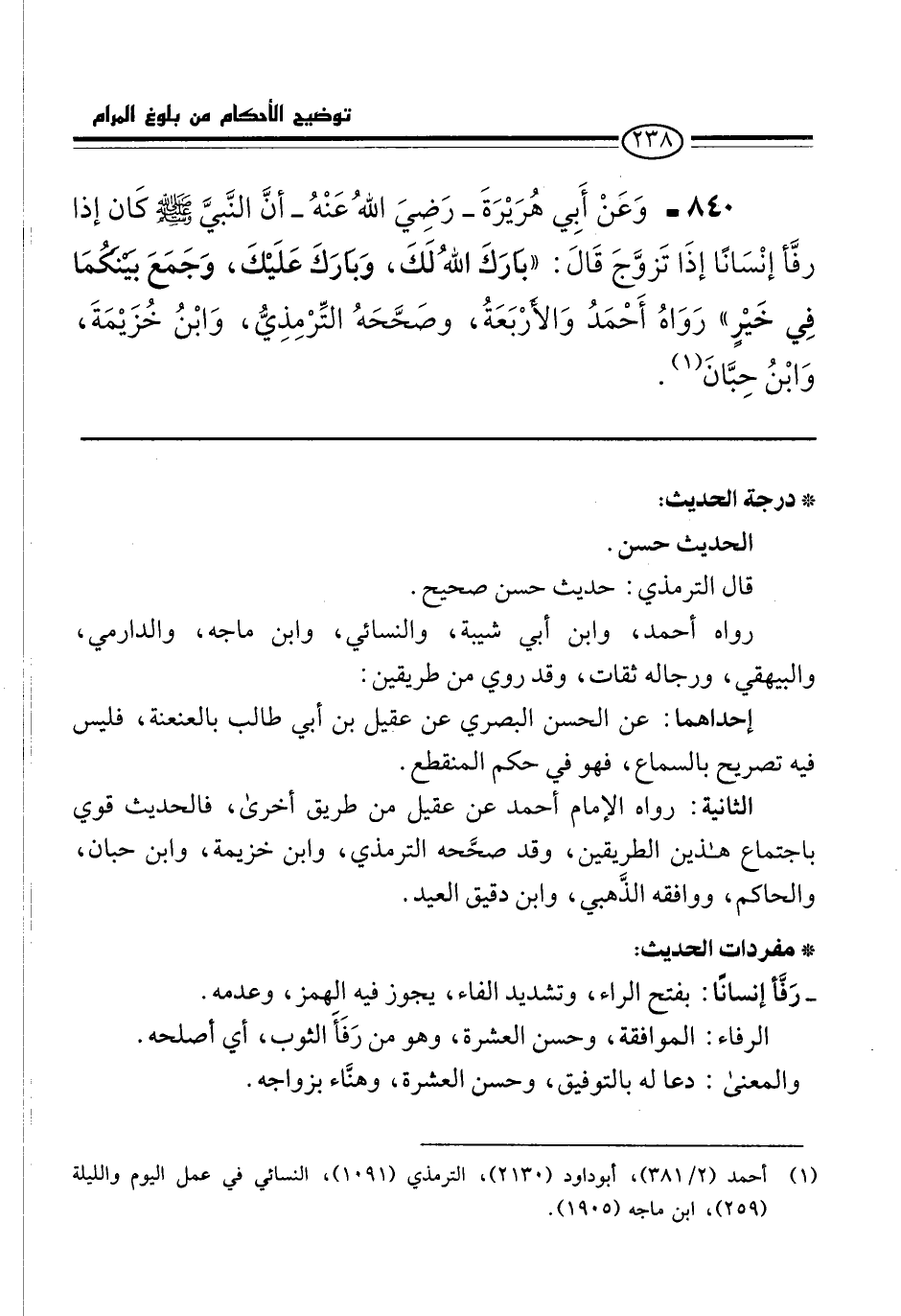 840 - وَعَنْ أِبي هُرَيْرَةَ -رَضِيَ اللهُ عَنْهُ- أنَّ النَّبيَّ -صلى الله عليه وسلم- كَان إذا رفَّأ إنْسَانًا إذَا تَزوَّجَ قَالَ: "بارَكَ اللهُ لَكَ، وَبارَكَ عَلَيْكَ، وَجَمَعَ بَيْنَكُمَا في خَيْرٍ" رَوَاهُ أَحْمَدُ وَالأرْبَعَةُ، وصَحَّحَهُ التِّرْمِذِيُّ، وَابْنُ خُزَيْمَةَ، وَابْنُ حِبَّانَ (¬1).