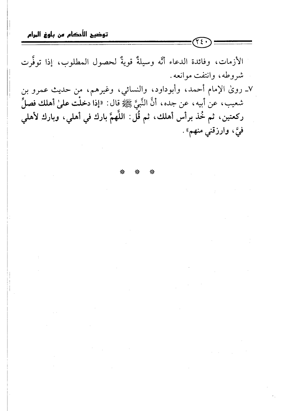 7 - روى الإِمام أحمد، وأبو داود، والنسائي، وغيرهم، من حديث عمرو بن شعيب، عن أبيه، عن جده، أنَّ النَّبيَّ -صلى الله عليه وسلم- قال: "إذا دخلْت على أهلك فصلِّ ركعتين، ثم خُذ برأس أهلك، ثم قل: اللَّهمَّ بارك في أهلي، وبارك لأهلي فيَّ، وارزقني منهم".