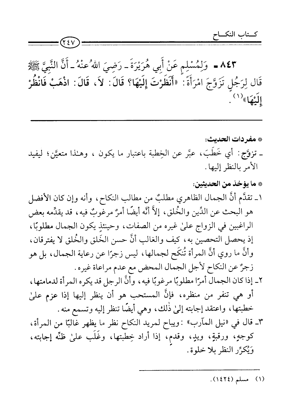 843 - وَلِمُسْلِمٍ عَنْ أَبِي هُرَيْرَةَ -رَضِيَ اللهُ عنْهُ- أَنَّ النَّبِيَّ -صلى الله عليه وسلم- قَال لِرَجُلٍ تزَوَّجَ امْرَأَةً: "أَنَظَرْتَ إِلَيْهَا؟ قَالَ: لاَ، قَالَ: اذْهَبْ فَانْظُرْ إِلَيْهَا" (¬1).