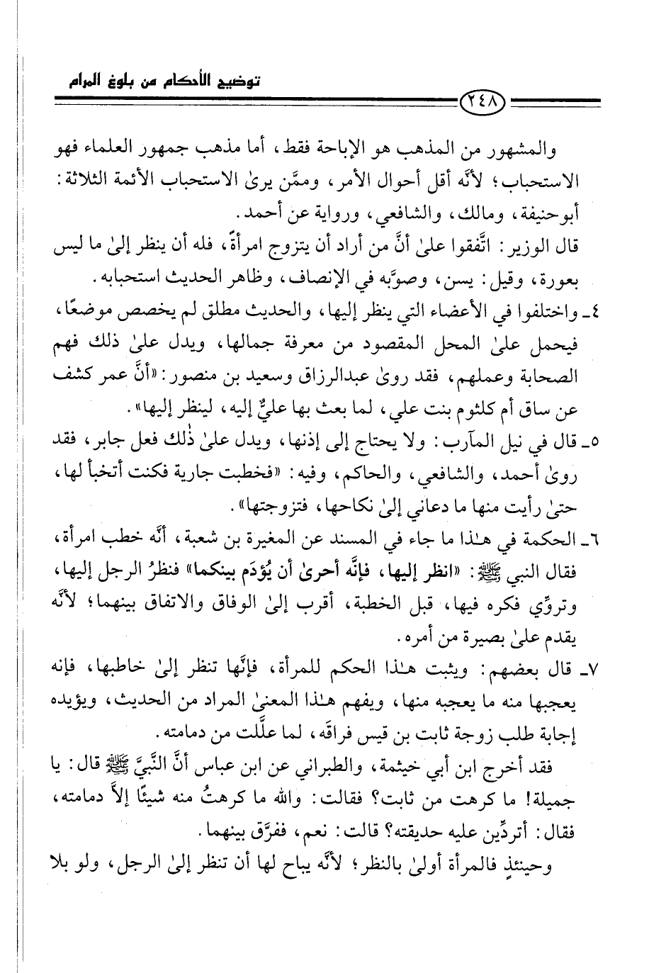 7 - قال بعضهم: ويثبت هذا الحكم للمرأة، فإنَّها تنظر إلى خاطبها، فإنه يعجبها منه ما يعجبه منها، ويفهم هذا المعنى المراد من الحديث، ويؤيده إجابة طلب زوجة ثابت بن قيس فراقَه، لما علَّلت من دمامته.