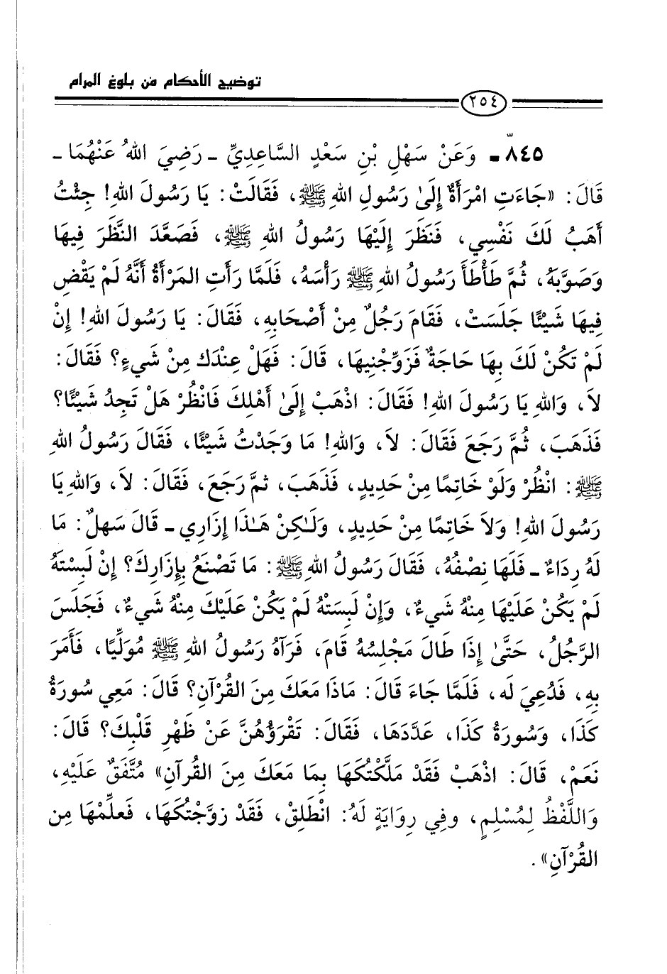 845 - وَعَنْ سَهْلِ بْنِ سَعْدٍ السَّاعِدِيِّ -رَضِيَ اللهُ عَنْهُمَا- قَالَ: "جَاءَتِ امْرَأةٌ إِلَى رَسُولِ اللهِ -صلى الله عليه وسلم-، فَقَالَتْ: يَا رَسُولَ اللهِ! جِئْتُ أهَبُ لَكَ نَفْسِي، فَنَظَرَ إِلَيْهَا رَسُولُ اللهِ -صلى الله عليه وسلم-، فَصَعَّدَ النَّظَرَ فِيهَا وَصَوَّبه، ثُمَّ طَأطَأَ رَسُولُ اللهِ -صلى الله عليه وسلم- رَأْسَهُ، فَلَمَّا رَأتِ المَرْأةُ أنَّهُ لَمْ يَقْضِ فِيهَا شَيْئًا جَلَسَتْ، فَقَامِ رَجُلٌ مِنْ أصْحَابِهِ، فَقَالَ: يَا رَسُولَ اللهِ! إِنْ لَمْ تَكُنْ لَكَ بِهَا حَاجَةٌ فَزَوِّجْنِيهَا، قَالَ: فَهَلْ عِنْدَك مِنْ شَيءِ؟ فَقَالَ: لاَ، وَاللهِ يَا رَسُولَ اللهِ! فَقَالَ: اذْهَبْ إِلَى أَهْلِكَ فَانْظُرْ هَلْ تَجِدُ شَيْئًا؟ فَذَهَبَ، ثُمَّ رَجَعَ فَقَالَ: لاَ، وَاللهِ! مَا وَجَدْتُ شَيئًا، فَقَالَ رَسُولُ اللهِ -صلى الله عليه وسلم-: انْظُرْ وَلَوْ خَاتِمًا مِنْ حَدِيدٍ، فَذَهَبَ، تمَّ رَجَعَ، فَقَالَ: لاَ، وَاللهِ يَا رَسُولَ اللهِ! وَلاَ خَاتِمًا مِنْ حَدِيدٍ، وَلَكِنْ هَذَا إِزَارِي -قَالَ سَهلٌ: مَا لَهُ رِدَاءٌ- فَلَهَا نِصْفُهُ، فَقَالَ رَسُولُ اللهِ -صلى الله عليه وسلم-: مَا تَصْنعُ بِإِزَارِكَ؟ إِنْ لَبِسْتَهُ لَمْ يَكُنْ عَلَيْهَا مِنْهُ شَيءٌ، وَإِنْ لَبِسَتْهُ لَمْ يَكُنْ عَلَيْكَ مِنْهُ شَيءٌ، فَجَلَسَ الرَّجُلُ، حَتَّا إِذَا طَالَ مَجْلِسُهُ قَامَ، فَرَآهُ رَسُولُ اللهِ -صلى الله عليه وسلم- مُوَلِّيًا، فَأَمَرَ بِهِ، فَدُعِيَ لَه، فَلَمَّا جَاءَ قَالَ: مَاذَا مَعَكَ مِنَ القُرْآنِ؟ قَالَ: مَعِي سُورَةُ كَذَا، وَسُورَهُّ كَذَا، عَدَّدَهَا، فَقَالَ: تَقْرَؤُهُنَّ عَنْ ظَهْرِ قَلْبِكَ؟ قَالَ: نَعَمْ، قَالَ: اذْهَبْ فَقَدْ مَلَّكْتُكهَا بِمَا مَعَكَ مِنَ القُرآنِ" مُتَّفَقٌ عَلَيْهِ، وَاللَّفْظُ لِمُسْلِمٍ، وفِي رِوَايَةٍ لَهُ: انْطَلِقْ، فَقَدْ زوَّجْتكهَا، فَعلِّمْهَا مِن القُرْآنِ".