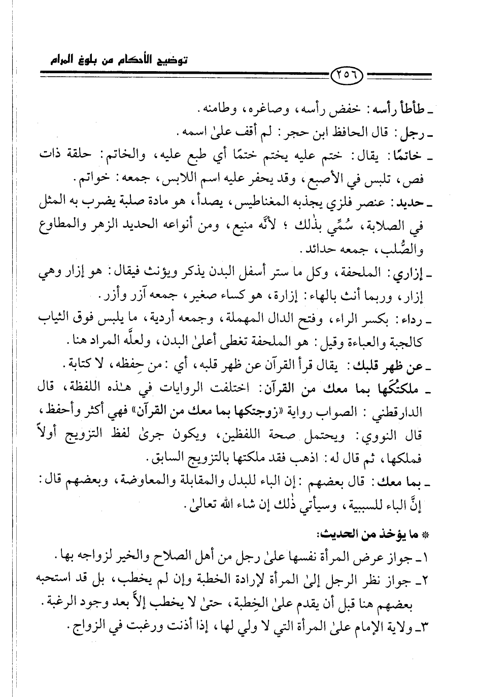 - ملكتُكَها بما معك من القرآن: اختلفت الروايات في هذه اللفظة، قال الدارقطني: الصواب رواية "زوجتكها بما معك من القرآن" فهي أكثر وأحفظ، قال النووي: ويحتمل صحة اللفظين، ويكون جرى لفظ التزويج أولًا فملكها، ثم قال له: اذهب فقد ملكتها بالتزويج السابق.
