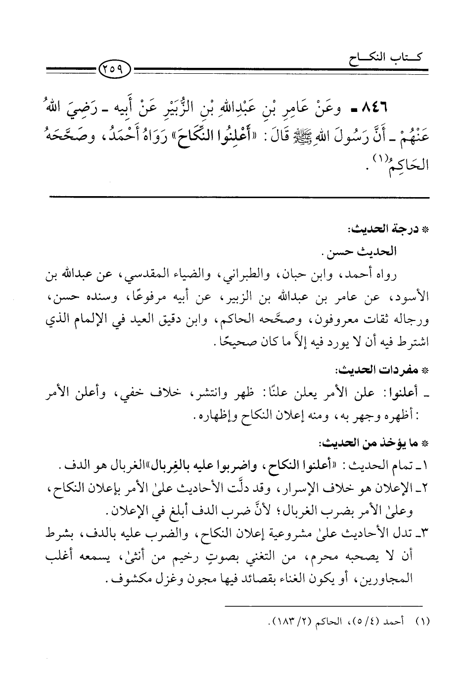 846 - وعَنْ عَامِرِ بْنِ عَبْدِ اللهِ بْنِ الزُّبَيْرِ عَنْ أَبِيه -رَضِيَ اللهُ عَنْهُمْ- أَنَّ رَسُولَ اللهِ -صلى الله عليه وسلم- قَالَ: "أَعْلِنُوا النِّكَاحَ" رَوَاهُ أَحْمَدُ، وصَحَّحَهُ الحَاكِمُ (¬1).